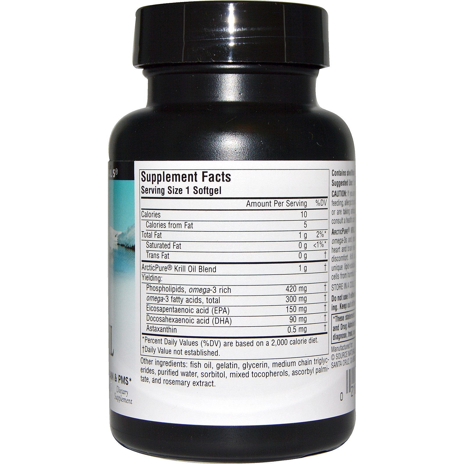 Krill Oil Blend Premium Omega-3 For Heart, Brain & PMS Dietary Supplement ArcticPure® Krill Oil is a premium source of potent omega-3s and phospholipids, which provide support for heart and brain health, as well as for PMS and menstrual discomfort. Krill oil additionally contains astaxanthin, a unique lipid-soluble antioxidant which may help protect cells from harmful free radicals.Sugg. Use1 Softgel daily with a meal.Other IngredientsFish oil, gelatin, glycerin, medium chain triglycerides, purified water, sorbitol, mixed tocopherols, ascorbyl palmitate, and rosemary extract. Contains shellfish (krill), fish and soy.Supplement FactsServing Size: 1 Softgel Amount Per Serving: %DV Calories 10 Calories from Fat 5 Total Fat 1 g 2%* Saturated Fat 0 g <1%* Trans Fat 0 g † ArcticPure Krill Oil Blend 1 g † Yielding: Phospholipids, omega-3 rich 420 mg † omega-3 fatty acids, total 300 mg † Eicosapentaenoic acid (EPA) 150 mg † Docosahexaenoic acid (DHA) 90 mg † Astaxanthin...