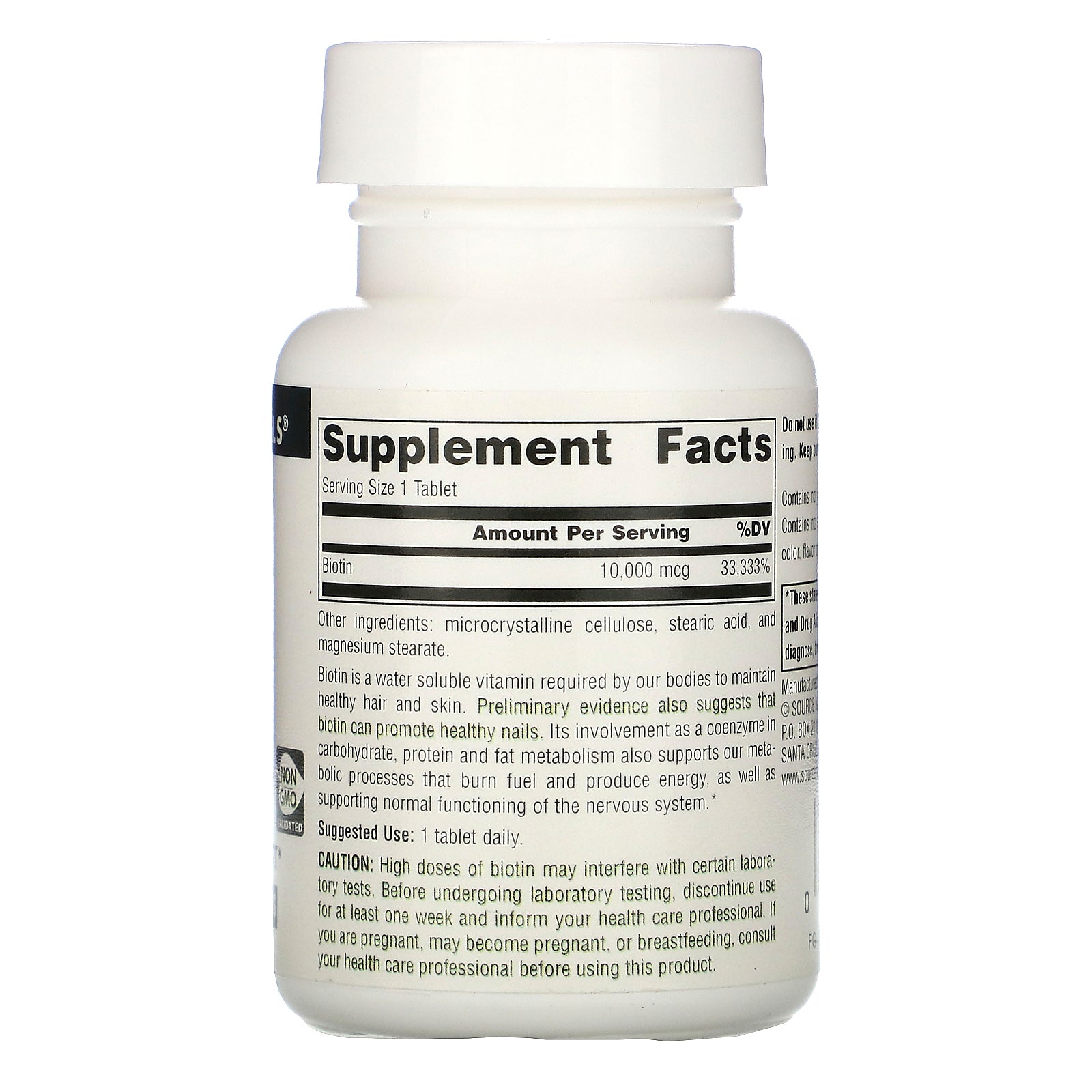 Dietary Supplement Hair, Skin, & Nail Support Non GMO Validated Biotin is a water soluble vitamin required by our bodies to maintain healthy hair and skin. Preliminary evidence also suggests that biotin can promote healthy nails. Its involvement as a coenzyme in carbohydrate, protein and fat metabolism also supports our metabolic processes that burn fuel and produce energy, as well as supporting normal functioning of the nervous system.Sugg. Use1 tablet daily.Other IngredientsMicrocrystalline cellulose, stearic acid, and magnesium stearate. Contains no yeast, dairy, egg, gluten, corn, soy or wheat. Contains no sugar, starch, salt, preservatives, or artificial color, flavor or fragrance.Supplement FactsServing Size: 1 Tablet Amount Per Serving %DV Biotin 10,000 mcg 33,333%DisclaimerWhile VitaminsUK strives to ensure the accuracy of its product images and information, some manufacturing changes to packaging and/or ingredients may be pending update on our site. Although items may occasionally ship with alternate packaging, freshness is always guaranteed....