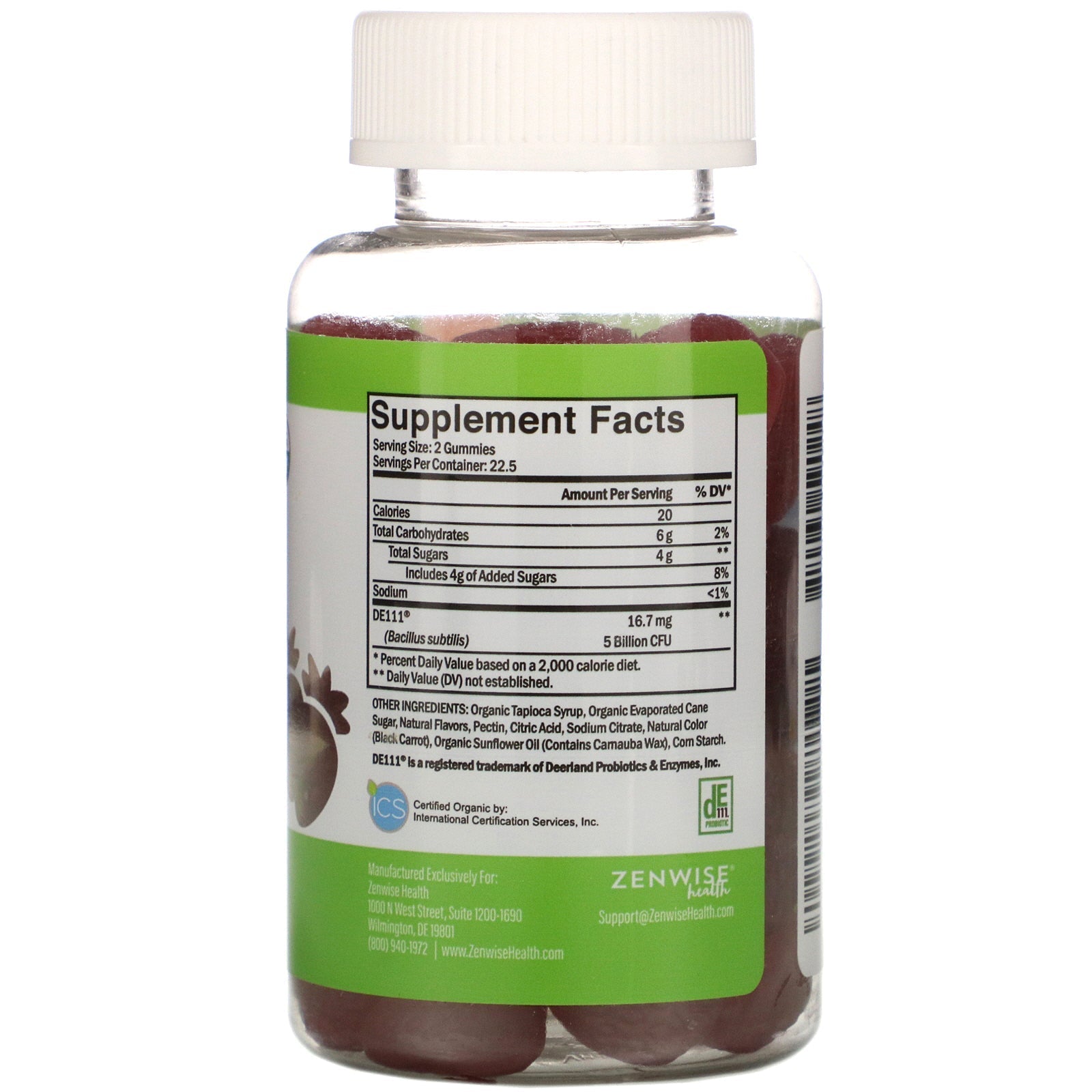 USDA Vegan 5 Billion CFU Non-GMO Dietary Supplement Certified By: International Certification Services, Inc Zenwise Health ® Good Gut ™ Gummies are certified , vegan-friendly chewables that feature proprietary DE111 ® , a spore-forming Probiotic that replenishes your microbiome to keep your tummy happy throughout the day.Sugg. UseEnjoy 2 or more gummies daily, or as directed by a healthcare professional.Other Ingredients tapioca syrup, evaporated cane sugar, natural flavors, pectin, citric acid, sodium citrate, natural color (black carrot), sunflower oil (contains carnauba wax), corn starch.Supplement FactsServing Size: 2 Gummies Servings Per Container : 22.5 Amount Per Serving %Daily Value* Calories 20 Total Carbohydrates 6 g 2% Total Sugars 4 g ** Includes 4 g of Added Sugars 8% Sodium <1% DE111 ® (Bacillus subtilis) 16.7 mg 5 Billion CFU ** *Percent Daily Value based on a 2,000 calorie diet. **Daily Value (DV) not established.DisclaimerWhile VitaminsUK strives to ensure the accuracy of...