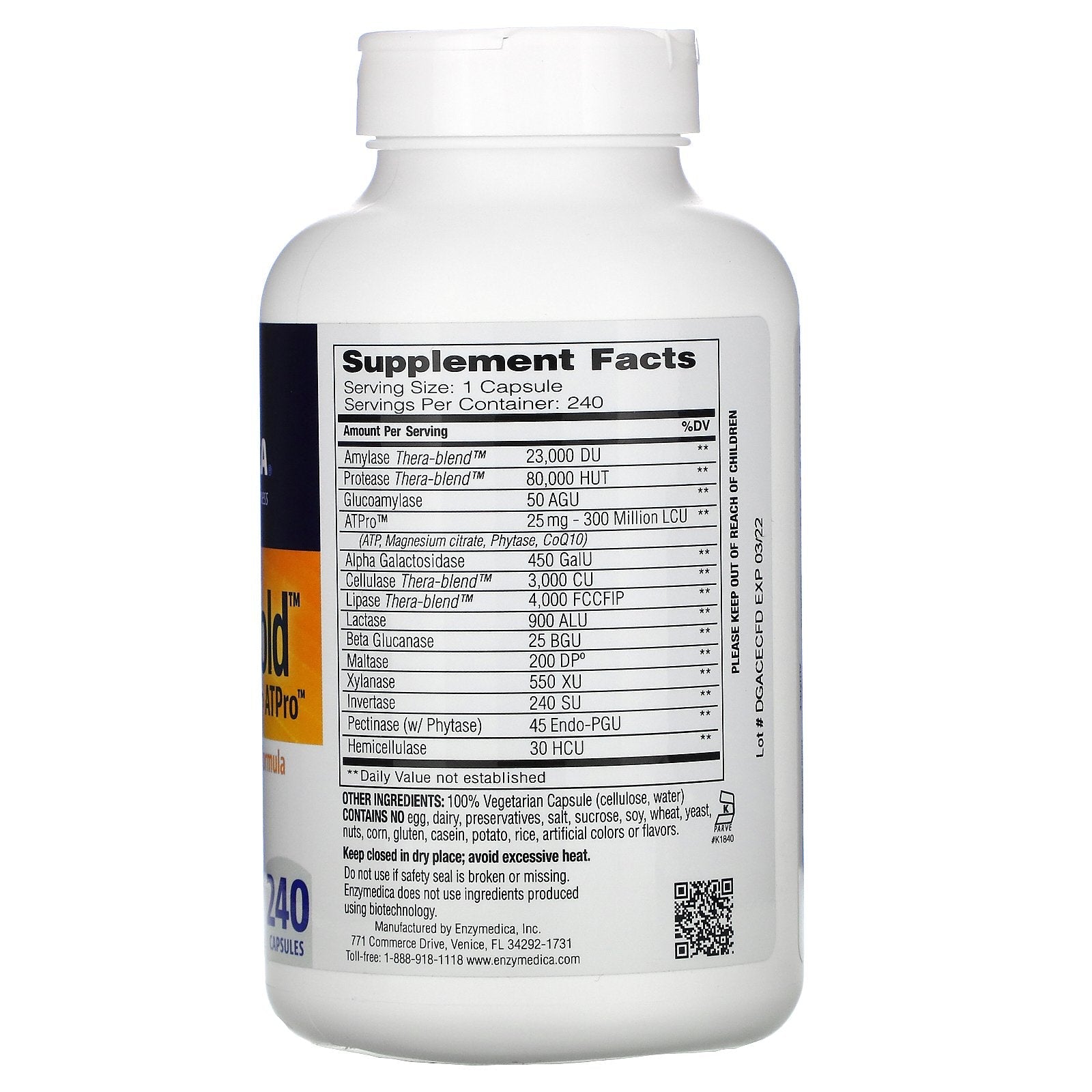 Serving Size: 1 Capsule Servings Per Container: 240 Amount Per Serving % DV Amylase Thera-blend 23,000 DU ** Protease Thera-blend 80,000 HUT ** Glucoamylase 50 AGU ** ATPro (ATP, Magnesium citrate, Alpha Lipoic Acid, CoQ10) 25 mg - 300 Million LCU ** Alpha Galactosidase 450 GalU ** Cellulase Thera-blend 3,000 CU ** Lipase Thera-blend 4,000 FCCFIP ** Lactase 900 ALU ** Beta Glucanase 25 BGU ** Maltase 200 DP ** Xylanase 550 XU ** Invertase 240 SU ** Pectinase (w/Phytase) 45 Endo-PGU ** Hemicellulase 30 HCU ** **Daily Value not established.Disclaimer
