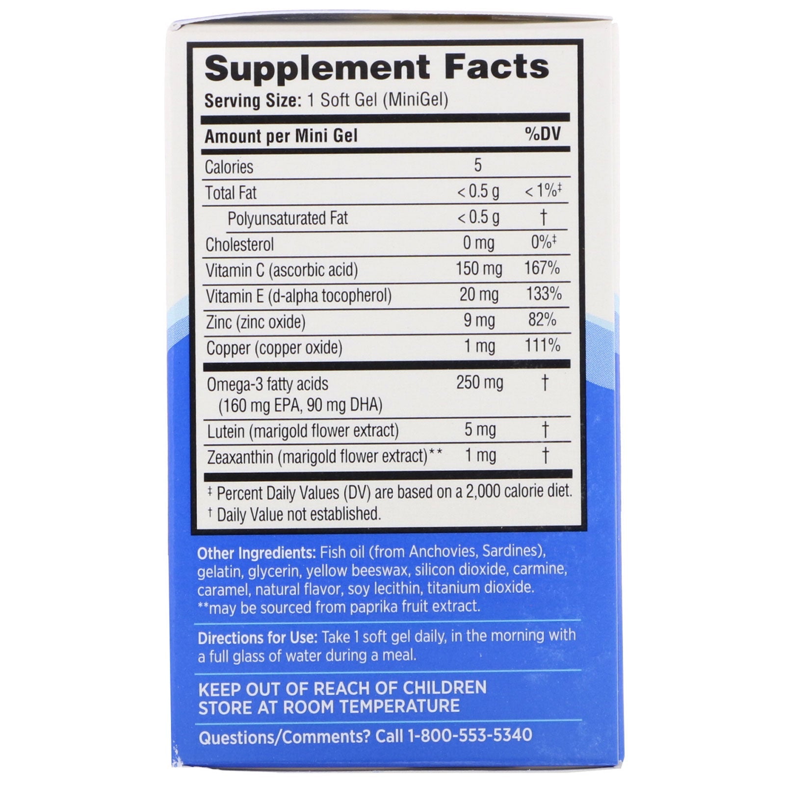 Eye Vitamin & Mineral Supplement Nourish Your Eyes MiniGels #1 Eye Vitamins§ Eye Health Formula Lutein Zeaxanthin Omega-3 Ingredients with a Purpose Key Eye Nutrients Lutein/Zeaxanthin helps filter harmful blue light Omega-3 helps maintain healthy tears & healthy retina Zinc supports healthy immune function Vitamin C & E antioxidants key to eye health New MiniGels 25% reduced size Easy to swallow No FD&C dyes Compare size vs. leading competitor§ §Date on fileSugg. UseTake 1 soft gel daily, in the morning with a full glass of water during a meal.Other IngredientsFish oil (from anchovies, sardines), gelatin, glycerin, yellow beeswax, silicon dioxide, carmine, caramel, natural flavor, soy lecithin, titanium dioxide.Supplement FactsServing Size: 1 Soft Gel (MiniGel) Amount per Mini Gel %DV Calories 5 Total Fat <0.5 g <1%‡ Polyunsaturated Fat <0.5 g † Cholesterol 0 mg 0%‡ Vitamin C (ascorbic acid) 150 mg 167% Vitamin E (d-alpha tocopherol) 20 mg 133% Zinc...