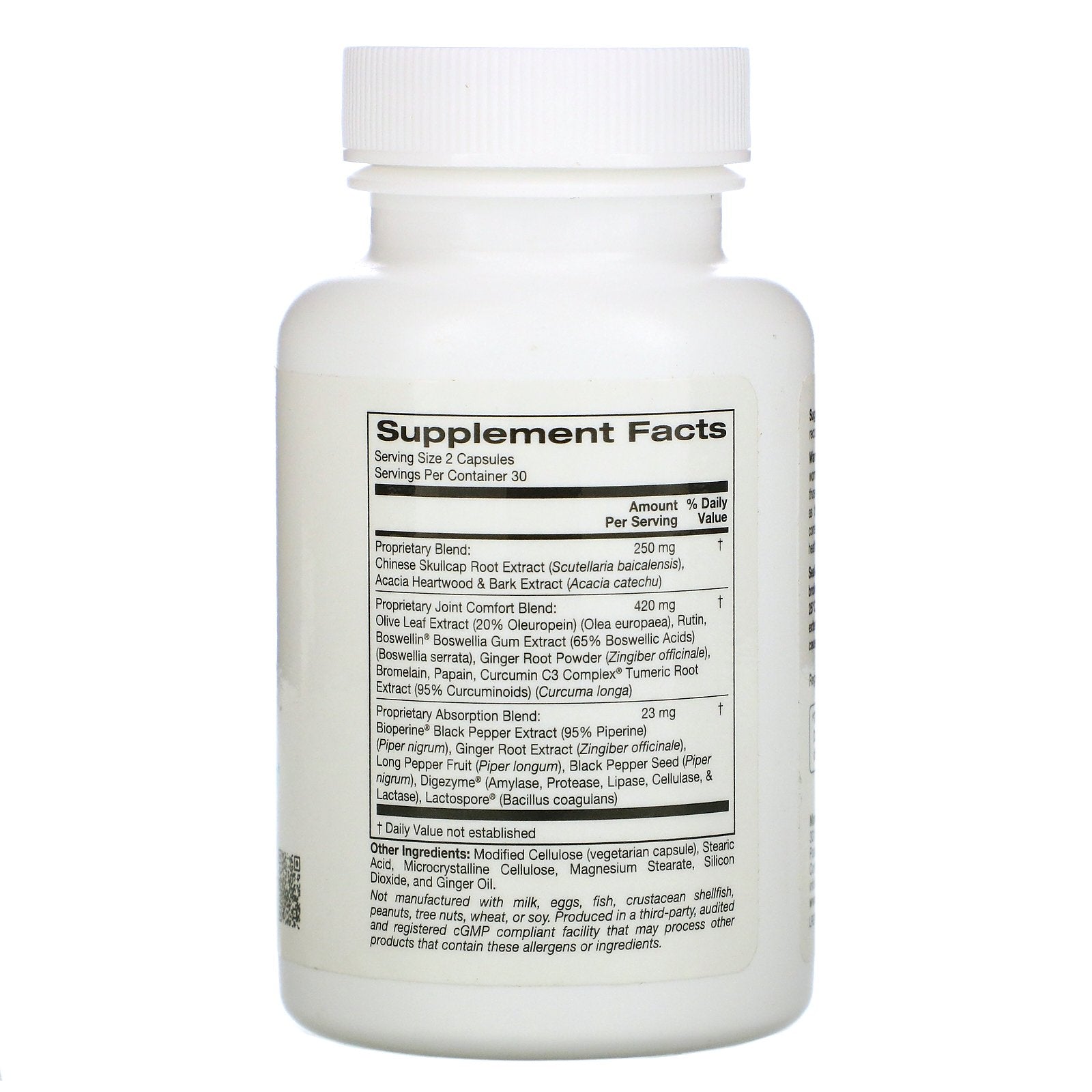 Serving Size: 2 Capsules Serving Per Container: 30 Amount Per Serving %Daily Value* Proprietary Blend: Chinese Skullcap Root Extract (Scutellaria baicalensis), Acacia Heartwood & Bark Extract (Acacia catechu) 250 mg † Proprietary Joint Comfort Blend: Olive Leaf Extract (20% Oleuropein) (Olea europaea), Rutin, Boswellin® Boswellia Gum Extract (65% Boswellic Acids) (Boswellia serrata), Ginger Root Powder (Zingiber officinale), Bromelain, Papain, Curcumin C3 Complex® Turmeric Root Extract (95% Curcuminoids) (Curcuma longa) 420 mg † Proprietary Absorption Blend: Bioperine® Black Pepper Extract (95% Piperine) (Piper nigrum), Ginger Root Extract (Zingiber officinale), Long Pepper Fruit (Piper longum), Black Pepper Seed (Piper nigrum), Digezyme® (Amylase, Protease, Lipase, Cellulase, & Lactase), Lactospore® (Bacillus coagulans) 23 mg † †Daily Value not established.