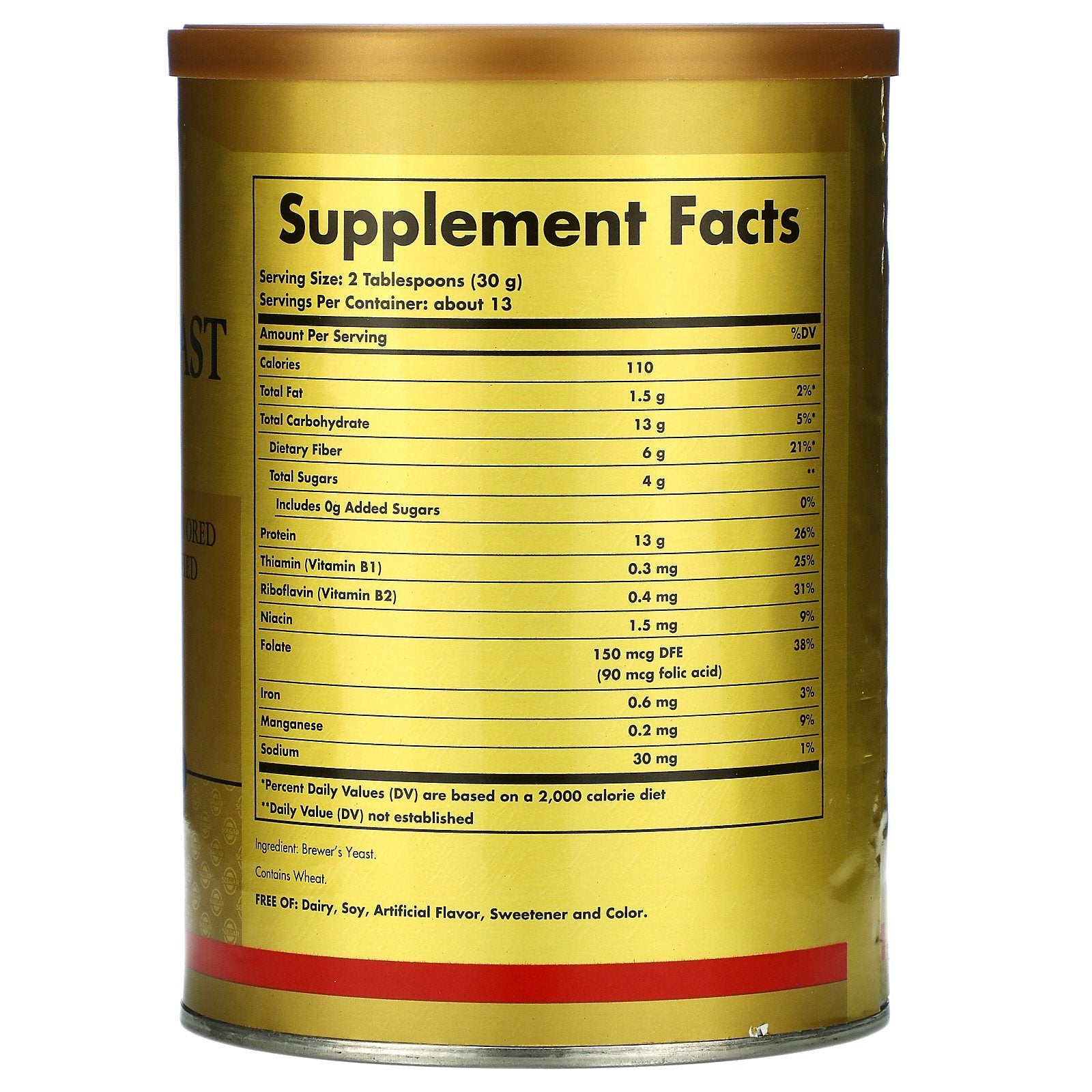 Since 1947 Premium - Natural - Unflavored Unsweetened - Unfortified Nothing Added Naturally Delicious Suitable for Vegetarians Dietary Supplement A natural primary Brewer's Yeast (Saccharomyces cerevisiae) that provides a source of amino acids, B-complex vitamins and more. Source: Most Brewer's Yeast are derived from the fermentation of beer: Such fermentation involves using grains (such as rice or wheat), malt, active yeast and the dried flowers of hops. Although efforts are made to debitter the yeast prior to final drying operations, most Brewer's Yeasts are, nevertheless, left with a bitter odor. After fermentation, the yeast is collected and dried using special techniques to preserve its protein, vitamin and mineral content.Sugg. UseAs a dietary supplement for adults, take two (2) tablespoons (30 g) daily. May be sprinkled on cereals, salads or incorporated into stews, soups, sauces, gravies, juices or baked goods.Other IngredientsBrewer's yeast. Contains wheat. Free of: Dairy, soy, artificial flavor, sweetener,...