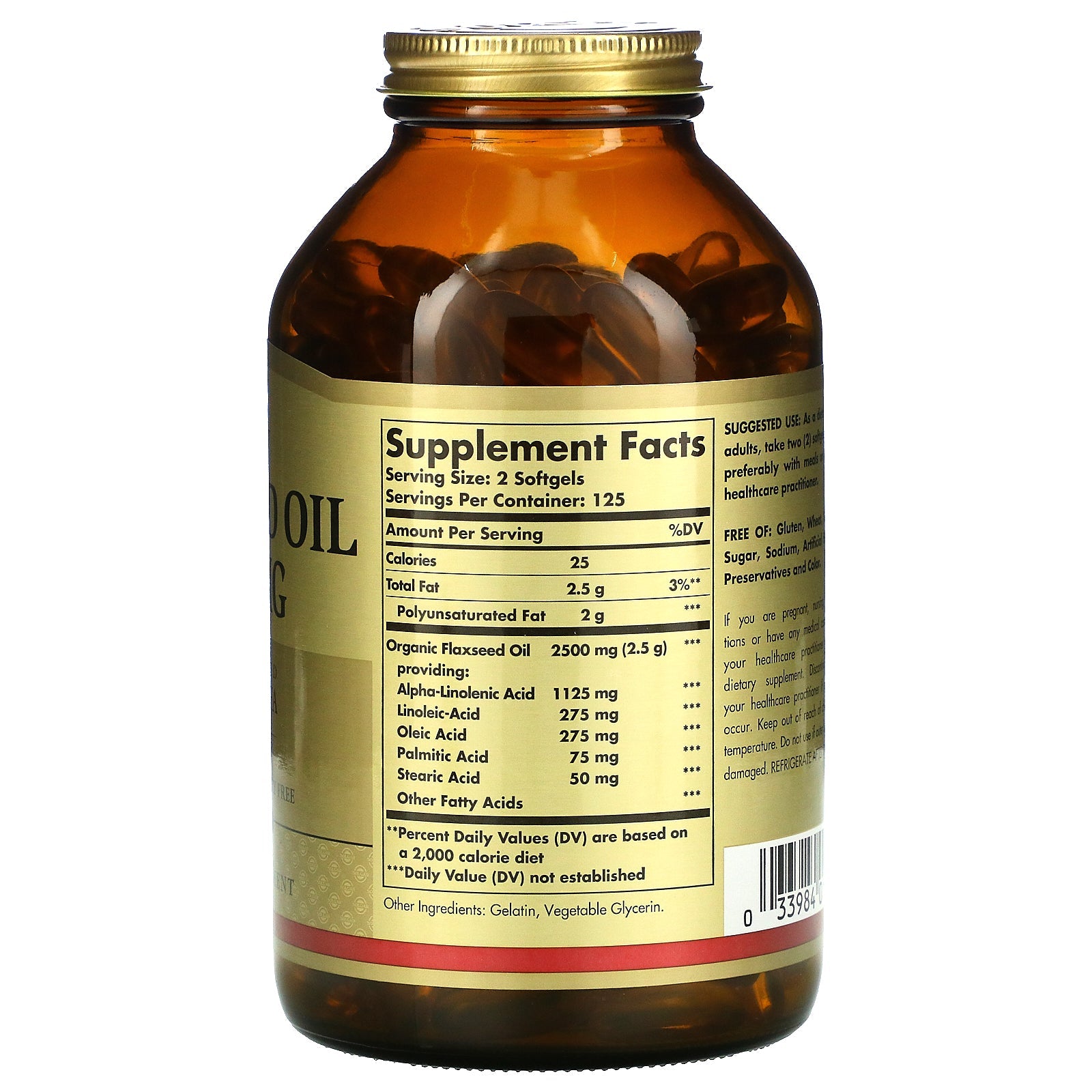 Since 1947 Cold Pressed Omega 3 EFA Non-GMO Gluten, Wheat & Dairy Free Dietary Supplement Flaxseed Oil is one of the premium sources of Alpha-Linolenic Acid (Omega 3), an essential fatty acid that can't be made by the body and must be obtained from diet. The oil is derived from the seeds of the Flax plant (Linum usitatissimum), one of the most concentrated vegetarian plant sources of Omega-3 fatty acids found in nature. Omega-3 Alpha-Linolenic Acid from Flaxseed Oil helps to support cardiovascular and skin health. This formulation offers premium, organic flaxseed oil, cold pressed without the use of chemical solvents.Sugg. UseAs a dietary supplement for adults, take two (2) softgels four times daily, preferably with meals or as directed by a healthcare practitioner.Other IngredientsGelatin, vegetable glycerin. Free of: Gluten, wheat, dairy, soy, yeast, sugar, sodium, artificial flavor, sweetener, preservatives and color.Supplement FactsServing Size: 2 Softgels Servings Per Container: 125...