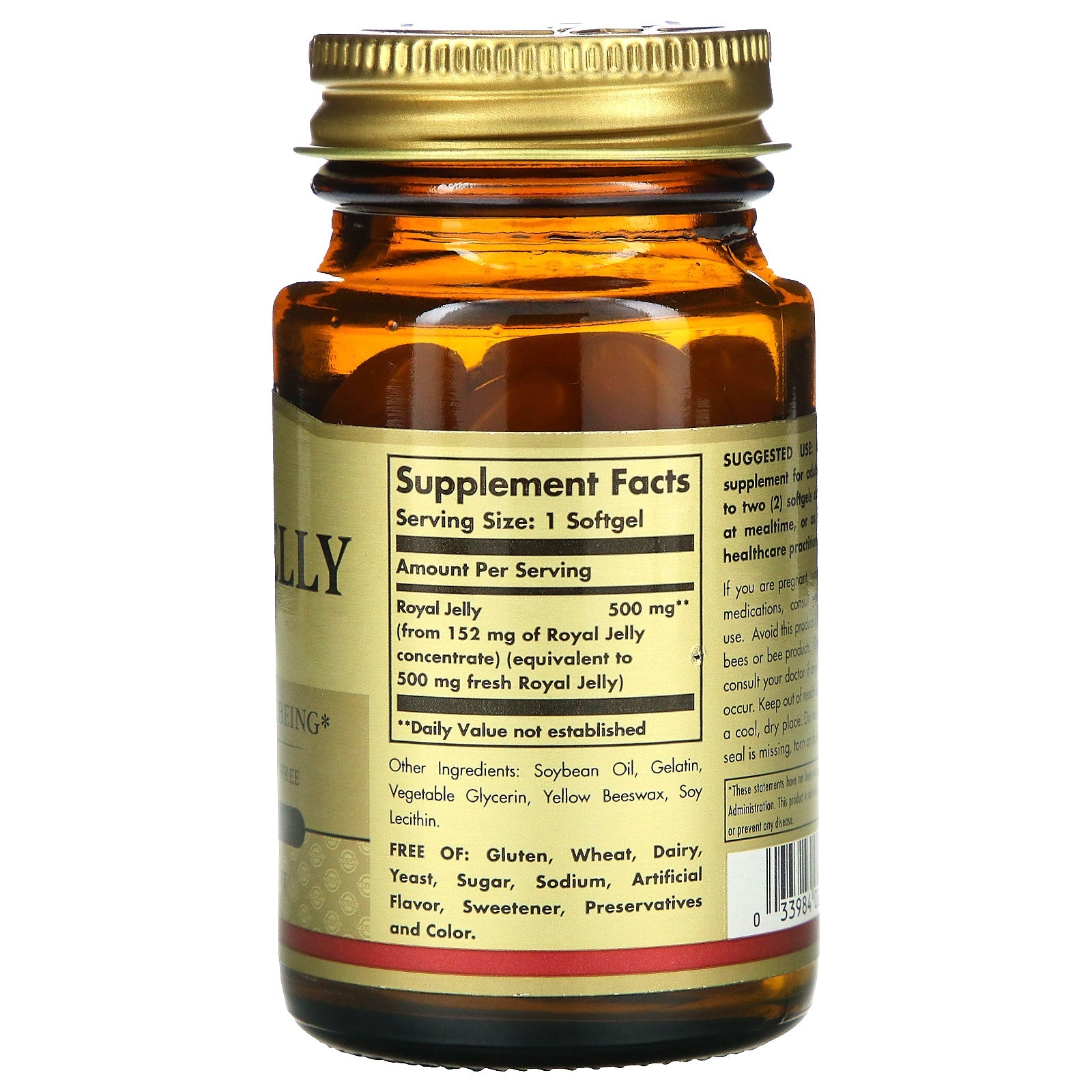 Since 1947 Nutritional Well Being Gluten, Wheat & Dairy Free Dietary Supplement Royal Jelly is the only food that the queen bee of a beehive lives on and it accounts for her incredible longevity, as she can live approximately 40 times longer than worker bees. Royal Jelly is a natural source of trace amounts of vitamins, minerals, amino acids, proteins and carbohydrates providing nutritional support courtesy of Mother Nature.Sugg. UseAs a dietary supplement for adults, take one (1) to two (2) softgels daily, preferably at mealtime, or as directed by a healthcare practitioner.Other IngredientsSoybean oil, gelatin, vegetable glycerin, yellow beeswax, soy lecithin. Free of: Gluten, wheat, dairy, yeast, sugar, sodium, artificial flavor, sweetener, preservatives and color.Supplement FactsServing Size: 1 Softgel Amount Per Serving % Daily Value Royal Jelly (from 152 mg of Royal Jelly concentrate) (equivalent to 500 mg fresh Royal Jelly) 500 mg ** **Daily Value not establishedDisclaimerWhile VitaminsUK...