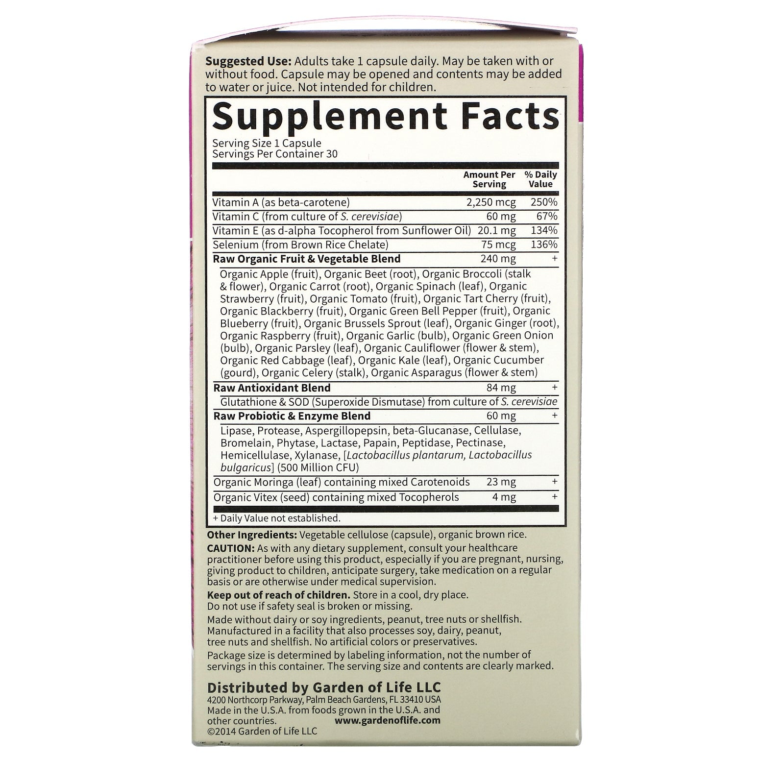 Serving Size: 1 Capsule Servings Per Container: 30 Amount Per Serving %Daily Value Vitamin A (as beta-carotene) 2,250 mcg 250% Vitamin C (from culture of S. cerevisiae) 60 mg 67% Vitamin E (as d-alpha Tocopherol from Sunflower Oil) 20.1 mg 134% Selenium (from Brown Rice Chelate) 75 mcg 136% Raw Organic Fruit & Vegetable Blend Organic Apple (fruit), Organic Beet (root), Organic Broccoli (stalk & flower), Organic Carrot (root), Organic Spinach (leaf), Organic Strawberry (fruit), Organic Tomato (fruit), Organic Tart Cherry (fruit), Organic Blackberry (fruit), Organic Green Bell Pepper (fruit), Organic Blueberry (fruit), Organic Brussels Sprout (leaf), Organic Ginger (root), Organic Raspberry (fruit), Organic Garlic (bulb), Organic Green Onion (bulb), Organic Parsley (leaf), Organic Cauliflower (flower & stem), Organic Red Cabbage (leaf), Organic Kale (leaf), Organic Cucumber (gourd), Organic Celery (stalk), Organic Asparagus (flower & stem) 240 mg + Raw Antioxidant Blend Glutathione & SOD (Superoxide Dismutase) from culture of S. cerevisiae 84 mg + Raw Probiotic & Enzyme Blend Lipase, Protease, Aspergillopepsin, beta-Glucanase, Cellulase, Bromelain, Phytase, Lactase, Papain, Peptidase, Pectinase, Hemicellulase, Xylanase, [Lactobacillus plantarum, Lactobacillus bulgaricus] (500 Million CFU), 60 mg + Organic Moringa (leaf) containing mixed Carotenoids 23 mg + Organic Vitex (seed) containing mixed Tocopherols 4 mg + + Daily Values not established.Disclaimer