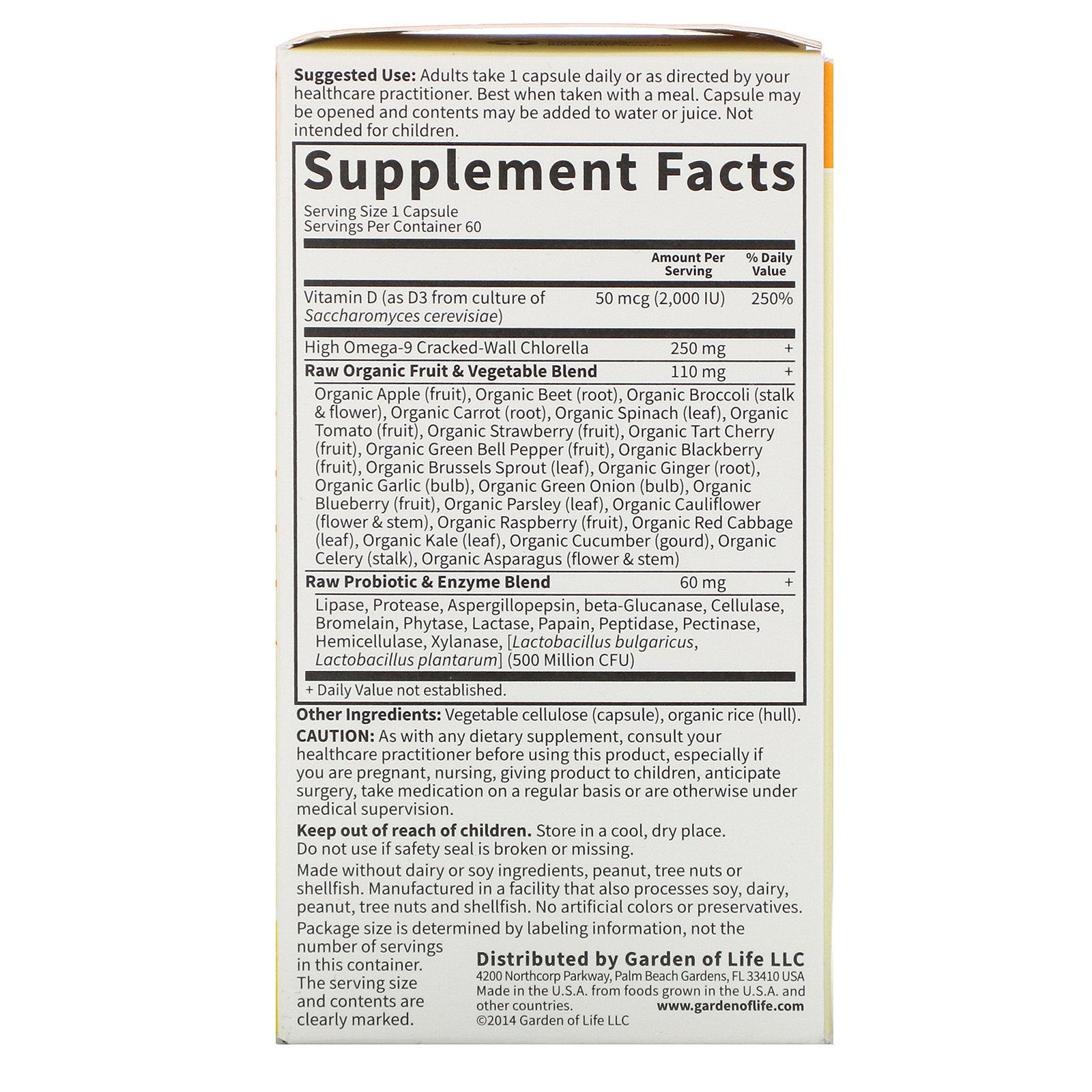 Serving Size: 1 Capsule Servings per Container: 60 Amount Per Serving % Daily Value Vitamin D (as D3 from culture of saccharomyces cerevisiae) 50 mcg (2,000 IU) 250% High Omega-9 Cracked-Wall Chlorella 250 mg + Raw Organic Fruit and Vegetable Blend Organic Apple (fruit), Organic Beet (root), Organic Broccoli (stalk & flower), Organic Carrot (root), Organic Spinach (leaf), Organic Tomato (fruit), Organic Strawberry (fruit), Organic Tart Cherry (fruit), Organic Green Bell Pepper (fruit), Organic Blackberry (fruit), Organic Brussels Sprout (leaf), Organic Ginger (root), Organic Garlic (bulb), Organic Green Onion (bulb), Organic Blueberry (fruit), Organic Parsley (leaf), Organic Cauliflower (flower & stem), Organic Raspberry (fruit), Organic Red Cabbage (leaf), Organic Kale (leaf), Organic Cucumber (gourd), Organic Celery (stalk), Organic Asparagus (flower & stem). 110 mg + Raw Probiotic & Enzyme Blend Lipase, Protease, Aspergillopepsin, beta-Glucanase, Cellulase, Bromelain, Phytase, Lactase, Papain, Peptidase, Pectinase, Hemicellulase, Xylanase, [Lactobacillus bulgaricus, Lactobacillus plantarum] (500 Million CFU) 60 mg + +Daily Value not established.Disclaimer