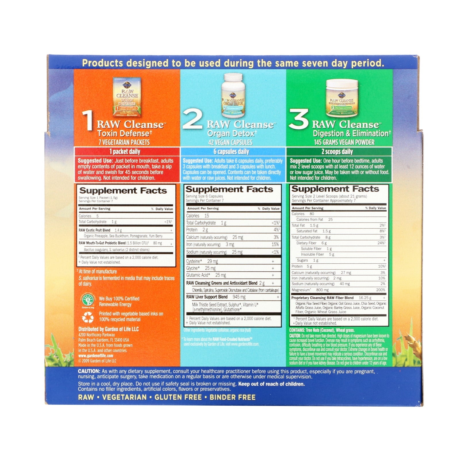 Products designed to be used during the same seven day period. 1. RAW Cleanse Toxin Defense 7 Vegetarian Packets - 1 packet daily Just before breakfast, adults empty contents of packet in mouth, take a sip of water and swish for 45 seconds before swallowing. Not intended for children. 2. RAW Cleanse Organ Detox 42 Vegan Capsules - 6 capsules daily Adults take 6 capsules daily, preferably 3 capsules with breakfast and 3 capsules with lunch. Capsules can be opened. Contents can be taken directly with water or raw juices. Not intended for children. 3. RAW Cleanse Digestion & Elimination 145 Grams Vegan Powder - 2 scoops daily One hour before bedtime, adults mix 2 level scoops with at least 12 ounces of water or low sugar juice. May be taken with or without food. Not intended for children.Other Ingredients