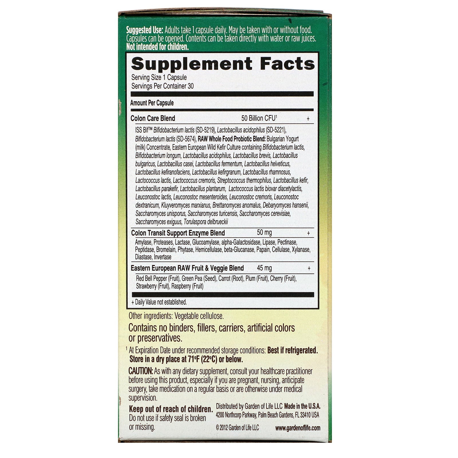 Serving Size: 1 Capsule Servings Per Container: 30 Amount Per Capsule % Daily Value Colon Care Blend ISS Bif™ Bifidobacterium lactis (SD-5219), Lactobacillus acidophilus (SD-5221), Bifidobacterium lactis (SD-5674), RAW Whole Food Probiotic Blend: Bulgarian Yogurt (milk) Concentrate, Eastern European Wild Kefir Culture containing Bifidobacterium lactis, Bifidobacterium longum, Lactobacillus acidophilus, Lactobacillus brevis, Lactobacillus bulgaricus, Lactobacillus casei, Lactobacillus fermentum, Lactobacillus helveticus, Lactobacillus kefiranofaciens, Lactobacillus kefirgranum, Lactobacillus rhamnosus, Lactococcus lactis, Lactococcus cremoris, Streptococcus thermophilus, Lactobacillus kefir, Lactobacillus parakefir, Lactobacillus plantarum, Lactococcus lactis biovar diacetylactis, leuconostoc lactis, Leuconostoc mesenteroides, Leuconostoc cremoris, Leuconostoc dextranicum, Kluyveromyces marxianus, Brettanomyces anomalus, Debaryomyces hansenii, Saccharomyces unisporus, Saccharomyces turicensis, Saccharomyces cerevisiae, Saccharomyces exiguus, Torulaspora delbrueckii 50 Billion CFU¹ + Colon Transit Support Enzyme Blend Amylase, Proteases, Lactase, Glucoamylase, alpha-Galactosidase, Lipase, Pectinase, Peptidase, Bromelain, Phytase, Hemicellulase, beta-Glucanase, Papain, Cellulase, Xylanase, Diastase, Invertase 50 mg + Eastern European RAW Fruit & Veggie Blend Red Bell Pepper (Fruit), Green Pea (Seed), Carrot (Root), Plum (Fruit), Cherry (Fruit), Strawberry (Fruit), Raspberry (Fruit) 45 mg + + Daily Value not established. ¹ At Expiration Date under recommended storage conditions: Best if refrigerated. Store in a dry place at 71ºF (22ºC) or below.Disclaimer