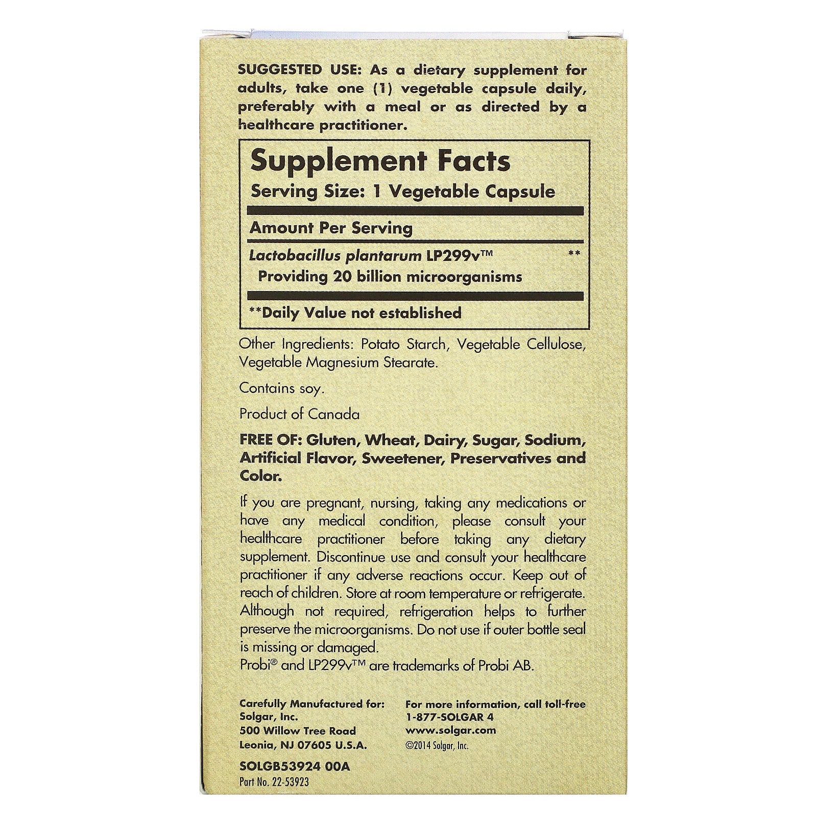 Since 1947 True Potency Probiotic Support Clinically Supported Results Survives Stomach Acid Naturally Occurring Live Organisms Gluten, Wheat & Dairy Free Suitable for Vegetarians Shelf Stable - Once Daily Dietary Supplement Understanding probiotics can make a real difference in "how you think" about them. Today's advances focus less on the quantity and number of different strains and more on identified strains that deliver clinically supported results, true potency even at expiration, and strains robust enough to survive even harsh stomach acid. That's the difference you'll find with Probi® 20 from Solgar. It delivers all this... and much more.Sugg. UseAs a dietary supplement for adults, take one (1) vegetable capsule daily, preferably with a meal or as directed by a healthcare practitioner.Other IngredientsPotato starch, vegetable cellulose, vegetable magnesium stearate. Contains soy. Free of: Gluten, wheat, dairy, sugar, sodium, artificial flavor, sweetener, preservatives and color.Supplement FactsServing Size: 1 Vegetable Capsule Amount Per...