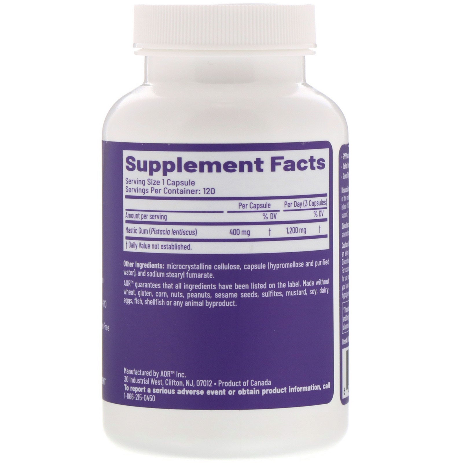 Serving Size: 1 Capsule Servings Per Container: 120 Amount Per Serving Per Capsule %Daily Value Per Day (3 Capsules) %Daily Value Mastic Gum (Pistacia lentiscus) 400 mg † 1,200 mg † † Daily Value not established.