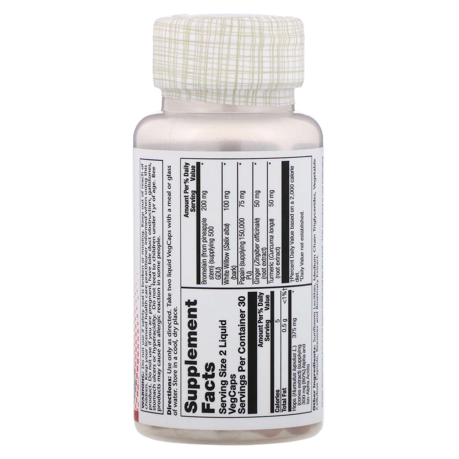 Dietary Supplement Fast-Acting Body Comfort Blend With 2X Alpha Acids Lab VerifiedSugg. UseUse only as directed. Take two liquid VegCaps with a meal or glass of water.Other IngredientsSunflower lecithin, medium chain triglycerides, vegetable cellulose capsule, beeswax and rosemary extract.Supplement FactsServing Size: 2 Liquid VegCaps Serving Per Container: 30 Amount Per Serving %Daily Value Calories 5 Total Fat 0.5 g <1% Hops (Humulus lupulus L.) (cones extract) (supplying 300 mg [80%] Alpha and Iso-Alpha Acids) 375 mg * Bromelain (from pineapple stem) (supplying 500 GDU) 200 mg * White Willow (Salix alba) (bark) 100 mg * Papain (supplying 150,000 PU) 75 mg * Ginger (Zingiber officinale) (root extract) 50 mg * Turmeric (Curcuma longa) (root extract) 50 mg * †Percent Daily Value based on a 2,000 calorie diet. *Daily Value not established.DisclaimerWhile VitaminsUK strives to ensure the accuracy of its product images and information, some manufacturing changes to packaging and/or ingredients...