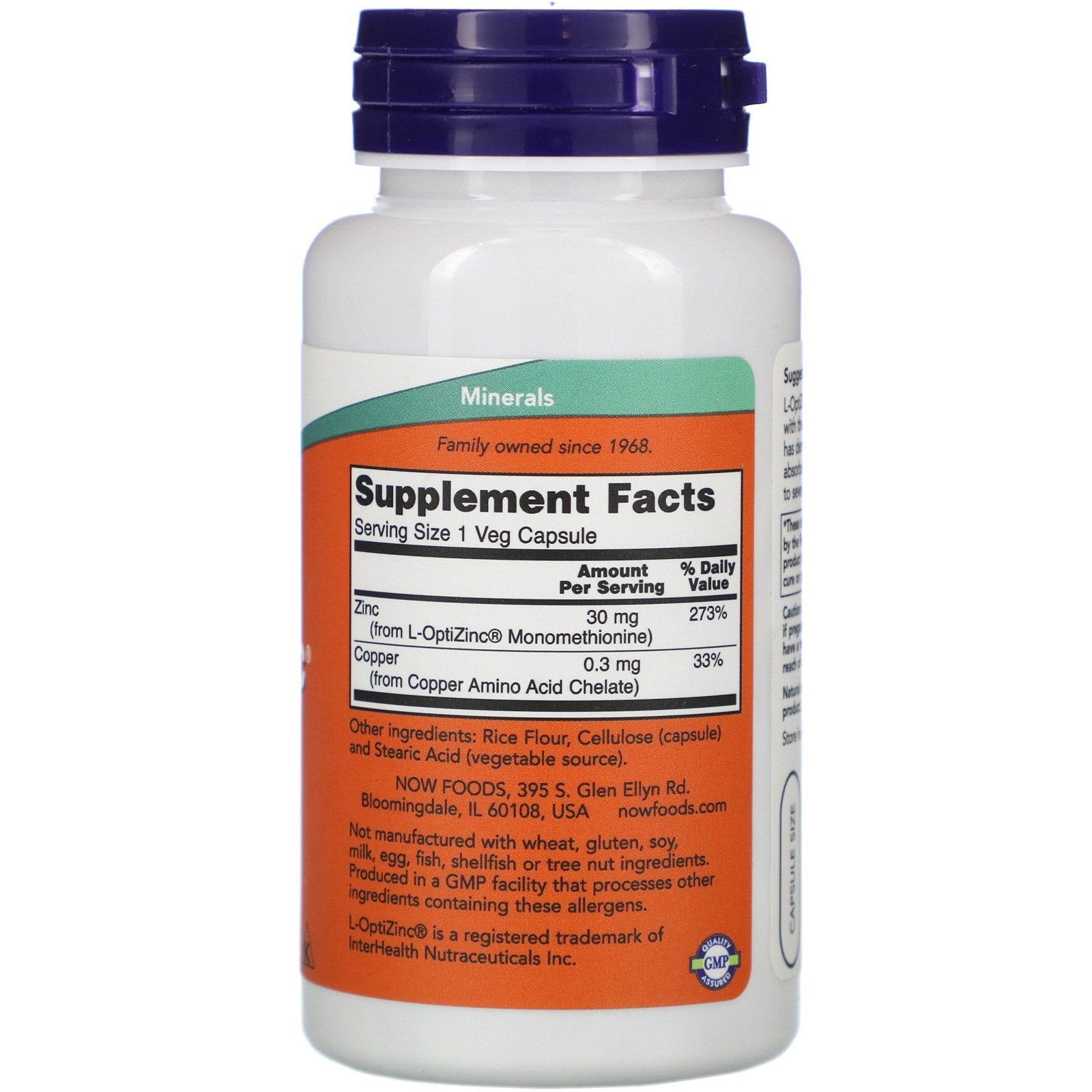 Immune Support Highly Bioavailable Form Supports Enzyme Function With Copper Non GMO A Dietary Supplement Vegetarian/Vegan Kosher Minerals Family Owned Since 1968 GMP Quality Assured L-OptiZinc is a form of Zinc complexed with the amino acids Methionine. Research has demonstrated this product to be better absorbed and retained longer compared to several other forms of Zinc tested.Sugg. UseTake 1 capsule daily.Other IngredientsRice flour, cellulose (capsule) and stearic acid (vegetable source). Not manufactured with wheat, gluten, soy, milk, egg, fish, shellfish or tree nut ingredients. Produced in a GMP facility that processes other ingredients containing these allergens.Supplement FactsServing Size: 1 Veg Capsule Amount Per Serving %Daily Value Zinc (from L-OptiZinc) Monomethionine) 30 mg 273% Copper (from Copper Amino Acid Chelate) 0.3 mg 33%DisclaimerWhile VitaminsUK strives to ensure the accuracy of its product images and information, some manufacturing changes to packaging and/or ingredients may be pending update on our site. Although items...