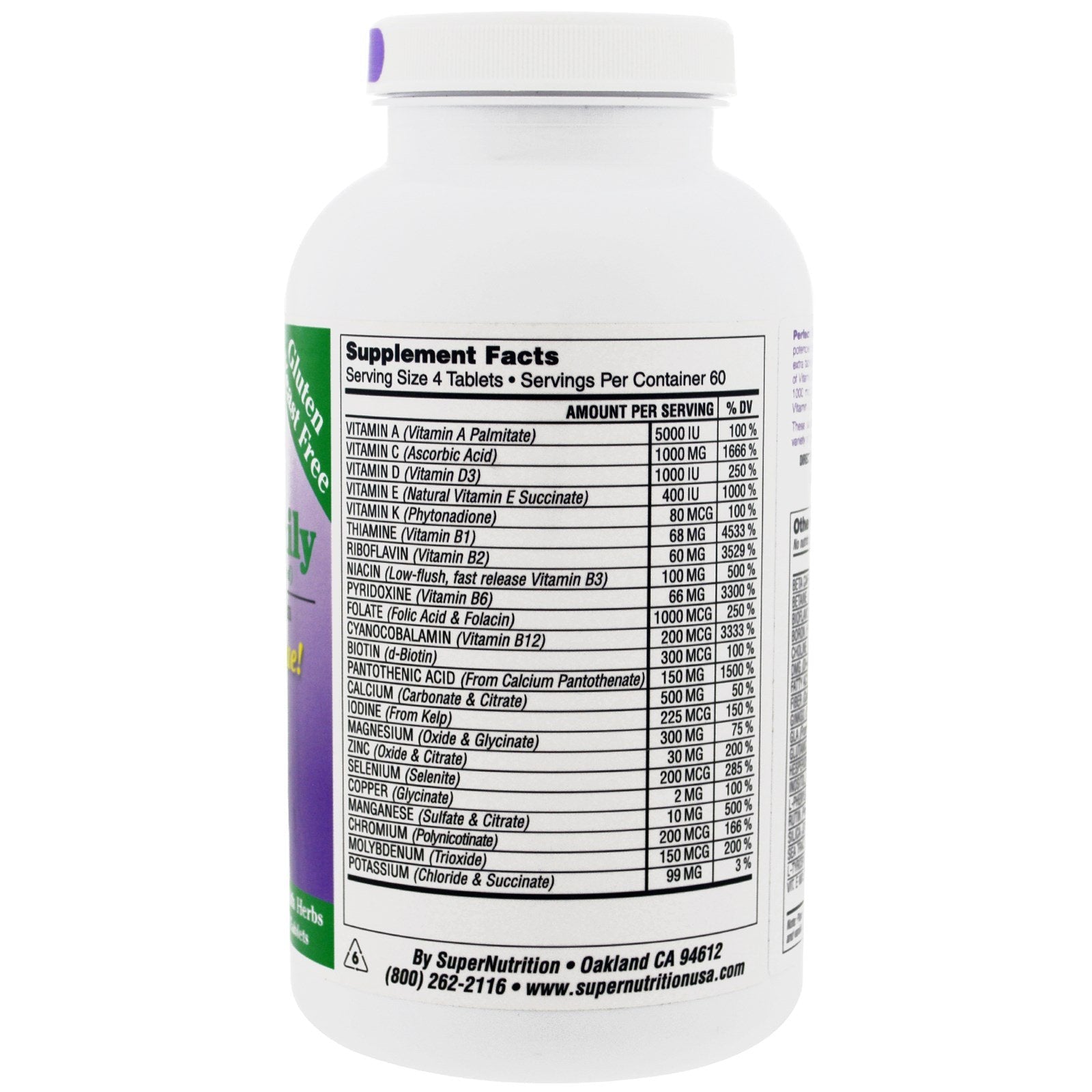 Serving Size: 4 Tablets Servings Per Container: 60 Amount Per Serving %DV Vitamin A (Vitamin A Palmitate) 5000 IU 100% Vitamin C (Ascorbic Acid) 1000 mg 1666% Vitamin D (Vitamin D3) 1000 IU 250% Vitamin E (Natural Vitamin E Succinate) 400 IU 1000% Vitamin K (Phytonadione) 80 mcg 100% Thiamine (Vitamin B1) 68 mg 4533% Riboflavin (Vitamin B2) 60 mg 3529% Niacin (Low-flush, fast release Vitamin B3) 100 mg 500% Pyridoxine (Vitamin B6) 66 mg 3300% Folate (Folic Acid & Folacin) 1000 mcg 250% Cyanocobalamin (Vitamin B12) 200 mcg 3333% Biotin (d-Biotin) 300 mcg 100% Pantothenic Acid (From Calcium Pantothenate) 150 mg 1500% Calcium (Carbonate & Citrate) 500 mg 50% Iodine (from Kelp) 225 mcg 150% Magnesium (Oxide & Glycinate) 300 mg 75% Zinc (Oxide & Citrate) 30 mg 200% Selenium (Selenite) 200 mcg 285% Copper (Glycinate) 2 mg 100% Manganese (Sulfate & Citrate) 10 mg 500% Chromium (Polynicotinate & Picolinate) 200 mcg 166% Molybdenum (Trioxide) 150 mcg 200% Potassium (Chloride & Succinate) 99 mg 3%Disclaimer