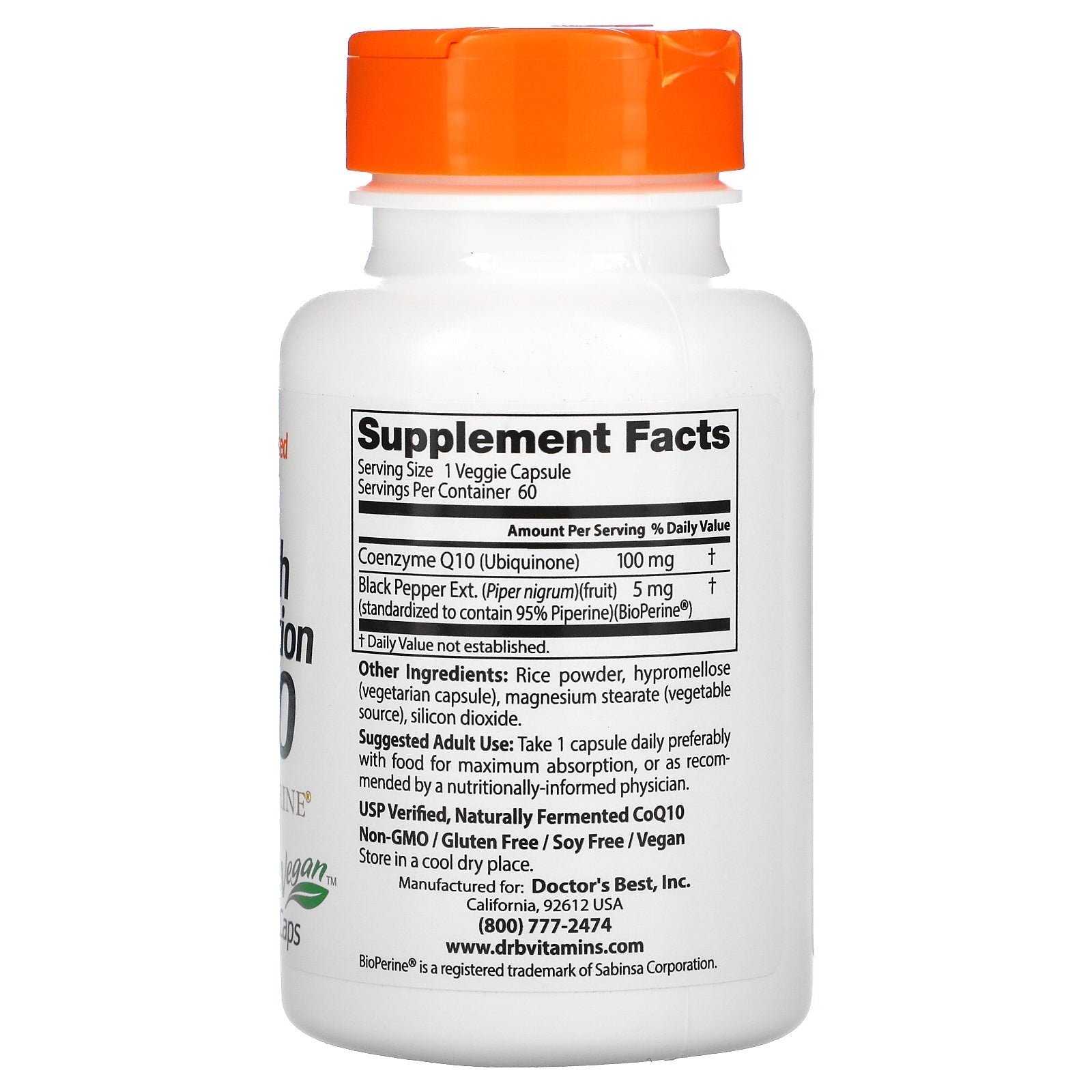 Science-Based Nutrition Helps Restore CoQ10 That May Be Depleted by Aging or Statin Drugs Dietary Supplement Non-GMO / Gluten Free / Soy Free / Vegan USP Verified, Naturally Fermented CoQ10 Doctor's Best High Absorption CoQ10 contains pure coenzyme Q10 (Ubiquinone) plus BioPerine®. CoQ10 helps support heart function and promote energy production in the cells. It is vital to the production of ATP (adenosine triphosphate), especially in the heart. Stress, free radicals, statin medications and aging can impact CoQ10 levels. CoQ10 is very important for the creation of energy, muscular contraction and the synthesis of protein. Studies have shown that BioPerine® increases CoQ10 absorption. Helps promote cardiovascular health and cellular energy Helps restore CoQ10 that may be depleted by aging and cholesterol lowering drugs (statins) Helps provide energy for those feeling occasional fatigue Formulated with BioPerine® black pepper extract to enhance absorption and bioavailability.Sugg. UseTake 1 capsule daily preferably with food...
