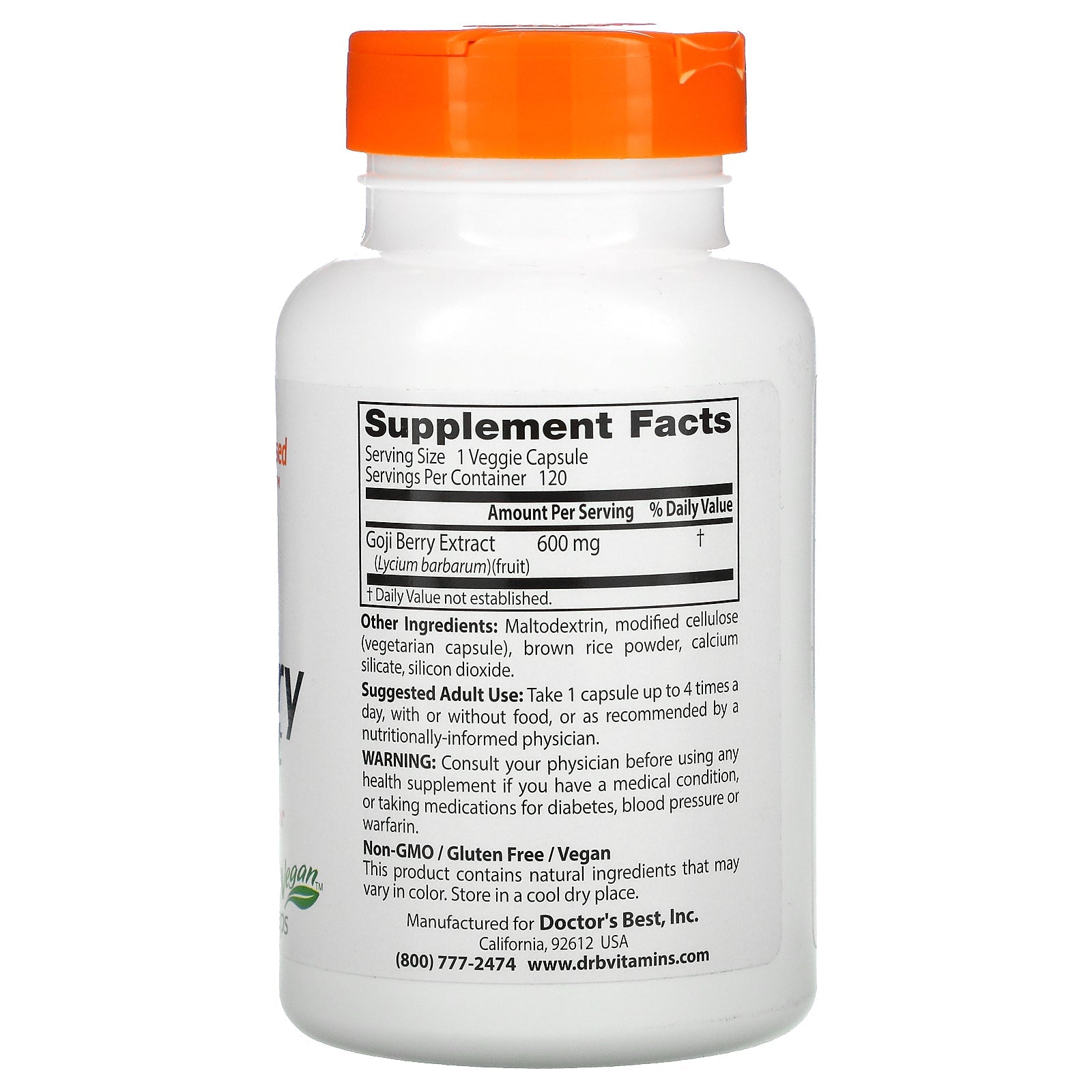 Science-Based Nutrition™ Helps Support Immune System Eye Health and Skin Complexion Dietary Supplement Non-GMO / Gluten Free / Vegan Doctor's Best Goji Berry Extract contains Goji berry extract from Goji berry (Lycium barbarum) fruit originated from Asia. For centuries, traditional herbalist have recognized the various health benefits of Goji berries in addition to its status as a highly nutritious food. Goji berries have long been revered as a universal tonic for their longevity-enhancing effect. Goji berries are renowned for its various health benefits that help support immune system, eye health, as well as provide beneficial effects on skin complexion. Helps support immune system Helps support eye health Helps support skin complexionSugg. UseAdult use: Take 1 capsule up to 4 times a day, with or without food, or as recommended by a nutritionally-informed physician.Other IngredientsMaltodextrin, modified cellulose (vegetarian capsule), brown rice powder, calcium silicate, silicon dioxide.Supplement FactsServing Size: 1 Veggie Capsule...