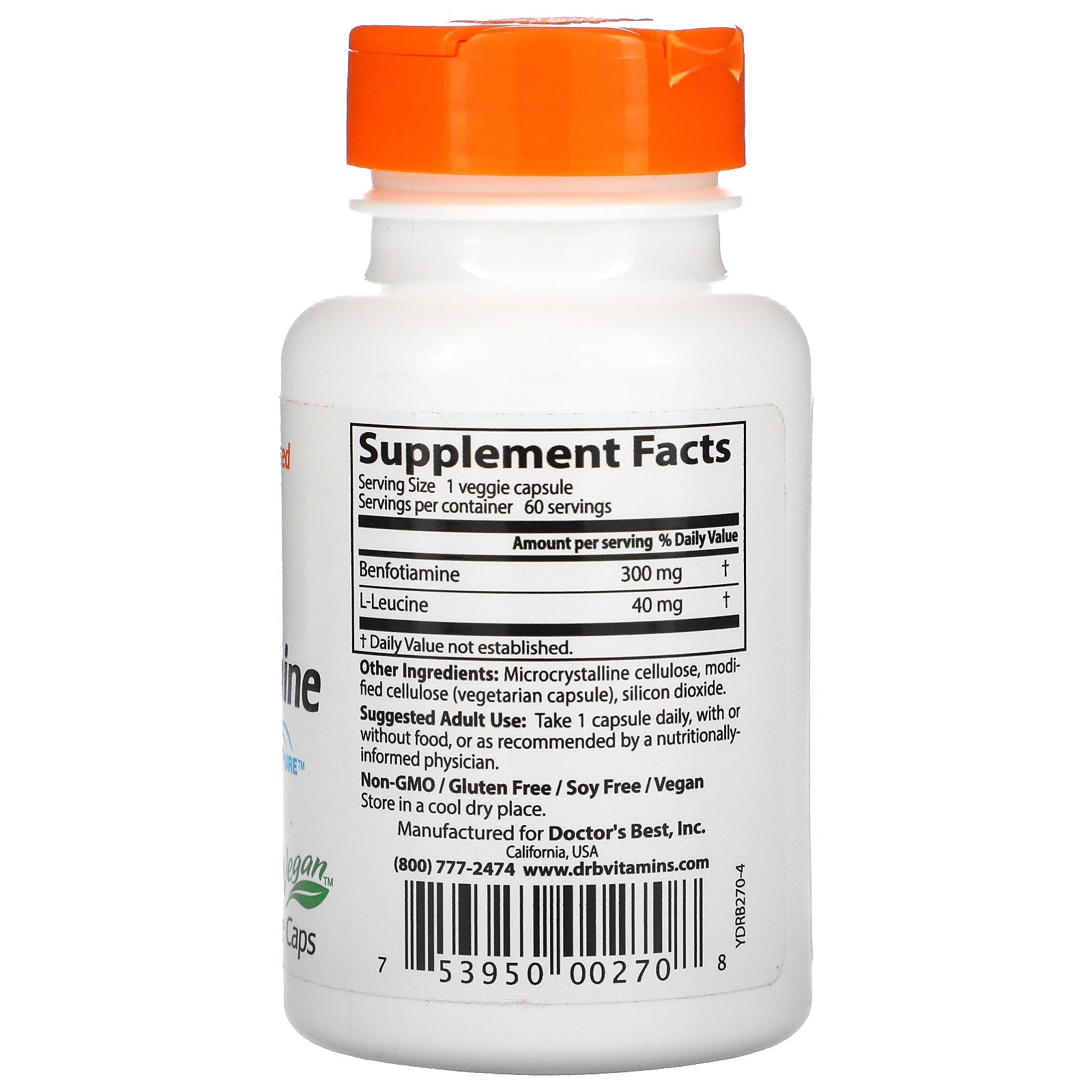 Science-Based Nutrition ™ Dietary Supplement Vegan ™ Non-GMO / Gluten Free / Soy Free Helps Maintain Healthy Glucose Metabolism. Benfotiamine (S-benzoylthiamine-O-monophosphate) is a derivative of thiamin, belonging to the family of compounds known as "allithiamines." Benfotiamine is fat-soluble and more bioavailable and physiologically active than thiamin. Benfotiamine raises the blood level of thiamin pyrophosphate (TPP), the biologically active co-enzyme of thiamin, and stimulates transketolase, a cellular enzyme essential for maintenance of normal glucose metabolic pathways. Helps maintain healthy cells in the presence of blood glucose Helps control formation of Advanced Glycation End products (AGEs) Helps normalize cellular processes fueled by glycose metabolitesSugg. UseAdult Use: Take 1 capsule daily, with or without food, or as recommended by a nutritionally-informed physician.Other IngredientsMicrocrystalline cellulose, modified cellulose (vegetarian capsule), silicon dioxide.Supplement FactsServing Size: 1 veggie capsule Serving Per Container: 60 servings Amount Per Serving %Daily Value* Benfotiamine 300 mg † L-Leucine 40 mg †...