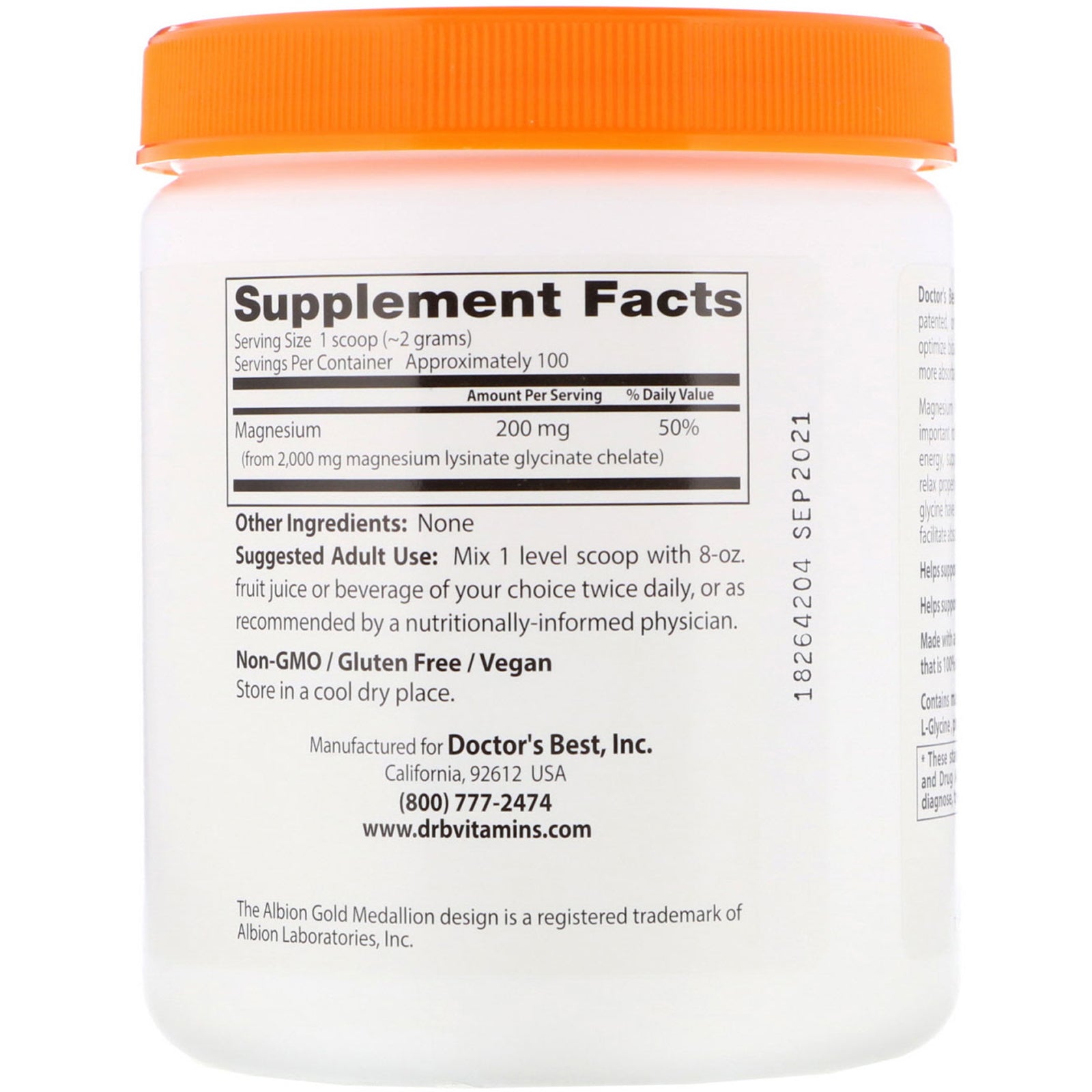 Science-Based Nutrition Helps Support Bone, Heart, Nerve and Muscle Health Dietary Supplement Non-GMO / Gluten Free / Vegan Doctor's Best High Absorption Magnesium Powder uses a patented, organic chelated delivery form of magnesium to optimize bioavailability and GI tolerance. It not buffered and more absorbable than magnesium oxide. Magnesium is an essential dietary mineral that plays many important roles which include: helping cells produce metabolic energy, supporting optimum nerve function, helping muscles relax properly and maintaining a healthy heartbeat. Lysine and glycine have been show to be efficient carriers for minerals that facilitate absorption in the intestinal tract. Helps support bone, heart, nerve and muscle health. Helps support normal magnesium levels that decrease with age. Made with a patented, organic form or bioavailable magnesium that is 100% chelated. Contains magnesium chelated with amino acids, L-Lysine and L-Glycine, providing high absorption.Sugg. UseMix 1 level scoop with 8-oz fruit juice or beverage...