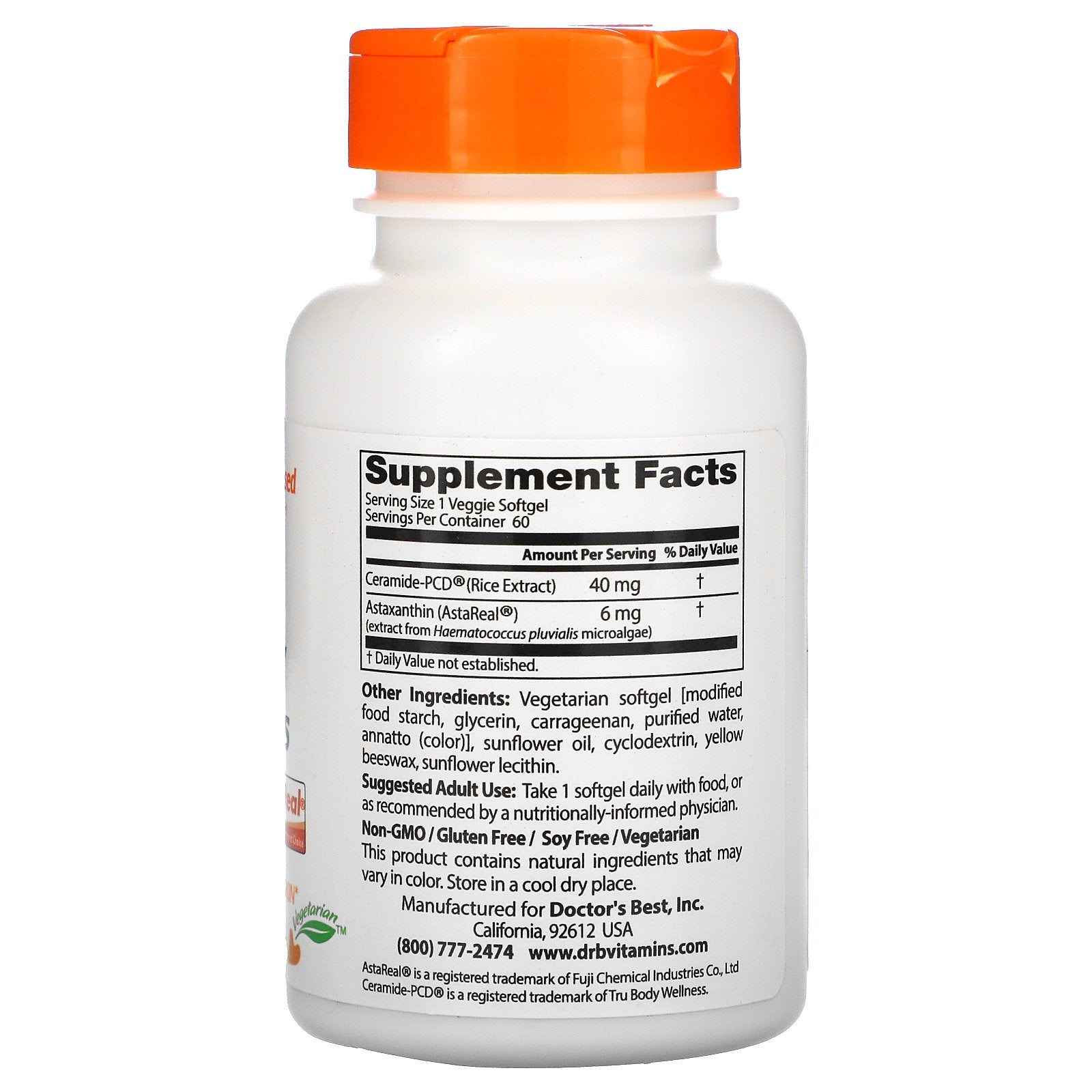 Science-Based Nutrition™ AstaReal® The Natural Astaxanthin of Choice Helps Support Healthy Skin Dietary Supplement Vegetarian Non-GMO/Gluten Free/Soy Free Doctor's Best Beauty Ceramides contains Ceramide-PCD®, rice phytoceramides and AstaReal® natural astaxanthin from extracts of microalgae Haematococcus pluvialis. Ceramide-PCD® has been clinically shown to support skin moisture, smoothness and elasticity, while the antioxidant properties of astaxanthin quenches free radicals and helps tackle age-related oxidative stress. This potent combination helps support healthy skin from within. Helps support skin moisture, smoothness and elasticity Helps quench free radicals and tackle age-related oxidative stress Helps support immune response, heart and joint health Veggie softgels, made with a gelatin-free alternativeSugg. UseAdult Use: Take 1 softgel daily with food or as recommended by a nutritionally-informed physician.Other IngredientsVegetarian softgel [modified food starch, glycerin, carrageenan, purified water, annatto (color)], sunflower oil, cyclodextrin, yellow beeswax, sunflower lecithin.Supplement FactsServing Size: 1 Veggie Softgel Serving Per Container: 60 Servings Amount Per Serving %Daily...