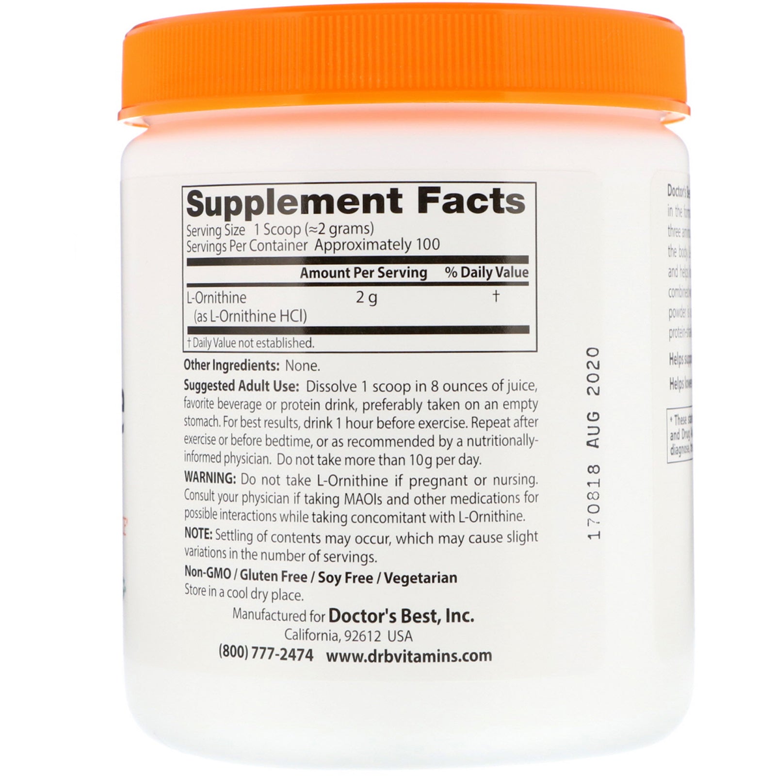 Science-Based Nutrition Helps Support Athletic Performance Vegetarian Dietary Supplement Non-GMO / Gluten Free / Soy Free Helps Support Athletic Performance Helps Lower Exercise-Induced Fatigue Doctor's Best Pure L-Ornithine is an amino acid that helps in the formation of citrulline, proline, and glutamic acid, three amino acids that help supply energy to every cell in the body. L-Ornithine helps support athletic performance and helps lower exercise-induced fatigue, especially when combined with other amino acids. Doctor's Best L-Ornithine powder is unflavored and can be combined with water, protein-shakes, or your favorite sports performance drink.Sugg. UseDissolve 1 scoop in 8 ounces of juice, favorite beverage or protein drink, preferably taken on an empty stomach. For best results, drink 1 hour before exercise. Repeat after exercise or before bedtime, or as recommended by a nutritionally informed physician. Do not take more than 10g per day.Other IngredientsNone.Supplement FactsServing Size: 1 Scoop (=2 grams) Servings Per...