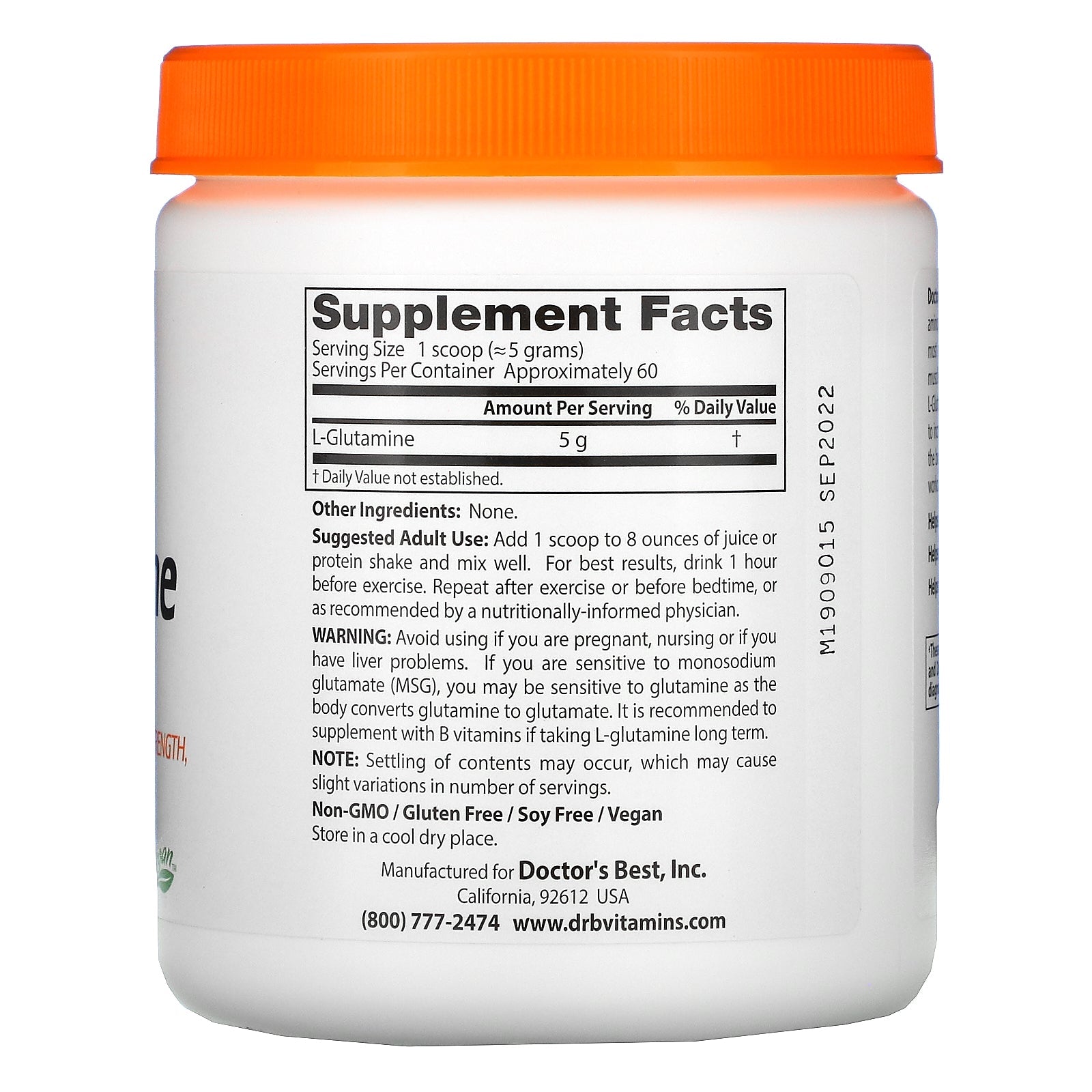 Science-Based Nutrition™ Dietary Supplement Non-GMO / Gluten Free / Soy Free / Vegan Doctor's Best L-Glutamine Powder contains Glutamine, an amino acid that is a building block of protein. Glutamine is most commonly used to support muscle growth, skeletal muscles and athletic endurance. Supplementing with L-Glutamine allows the body the much-needed amino acids to increase muscle hydration. This is an essential process in the body that support muscle recovery from high intensity workouts. Help support muscle mass and strength Help support muscle hydration Helps support post-workout recoverySugg. UseAdult use: Add 1 scoop to 8 ounces of juice or protein shake and mix well. For best results, drink 1 hour before exercise. Repeat after exercise or before bedtime, or as recommended by a nutritionally-informed physician.Other IngredientsNone.Supplement FactsServing Size: 1 scoop (= 5 grams) Servings Per Container: Approximately 60 Amount Per Serving %Daily Value L-Glutamine 5 g † †Daily Value not established.DisclaimerWhile...