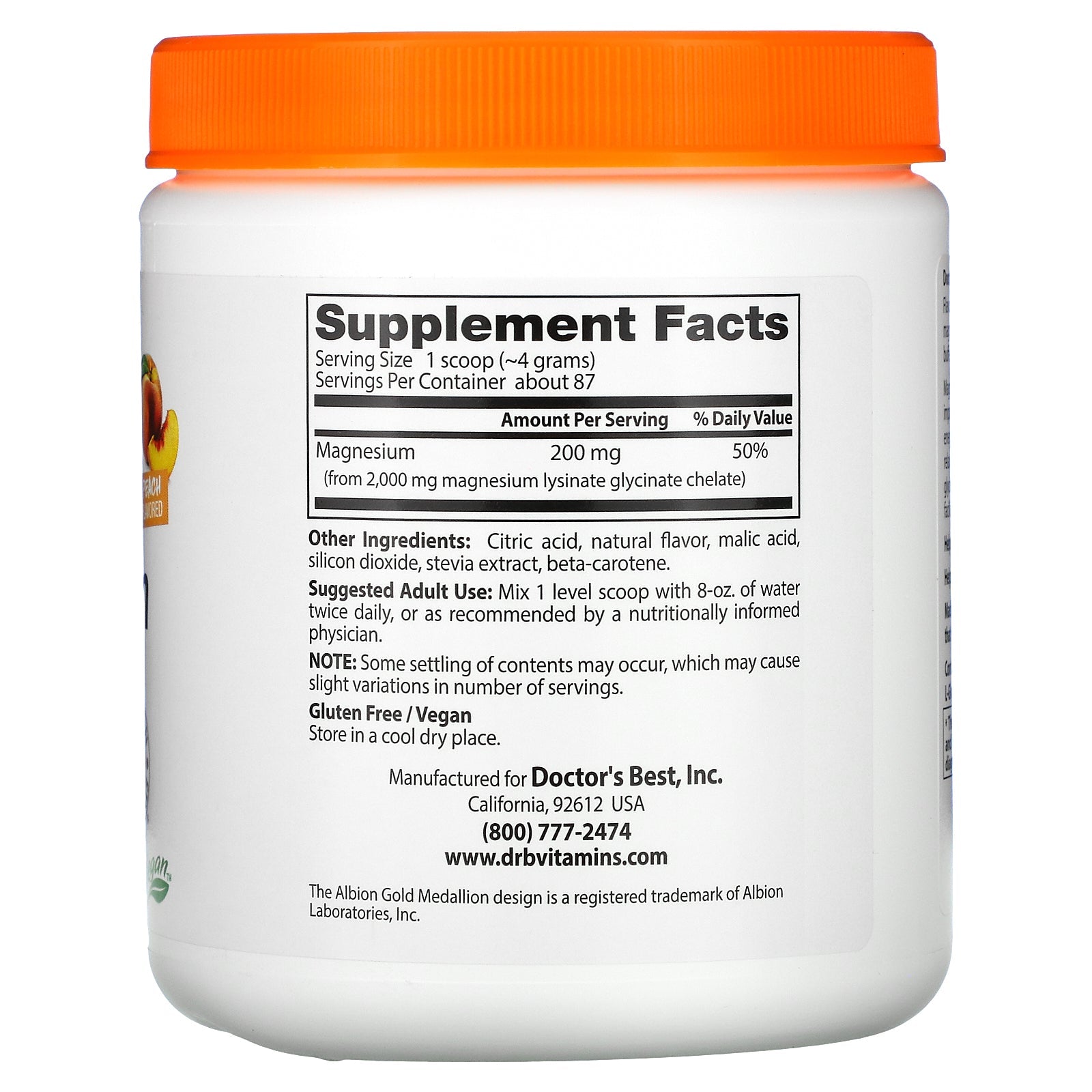 Science-Based Nutrition™ Albion Minerals Helps Support Bone, Heart, Nerve and Muscle Health Dietary Supplement Vegan Gluten Free Doctor's Best High Absorption Magnesium Powder (Peach Flavored) uses a patented, organic, chelated delivery form of magnesium to optimize bioavailability and GI tolerance. It is not buffered and more absorbable than magnesium oxide. Magnesium is an essential dietary mineral that plays many important roles which include: helping cells produce metabolic energy, supporting optimum nerve function, helping muscles relax properly and maintaining a healthy heartbeat. Lysine and glycine have been shown to be efficient carriers for minerals that facilitate absorption in the intestinal tract. Helps support bone, heart, nerve and muscle health Helps support normal magnesium levels that decrease with age Made with a patented, organic form or bioavailable magnesium that is 100% chelated Contains magnesium chelated with amino acids, L-Lysine and L-Glycine, providing high absorptionSugg. UseAdult use: Mix 1 level scoop with 8-oz...
