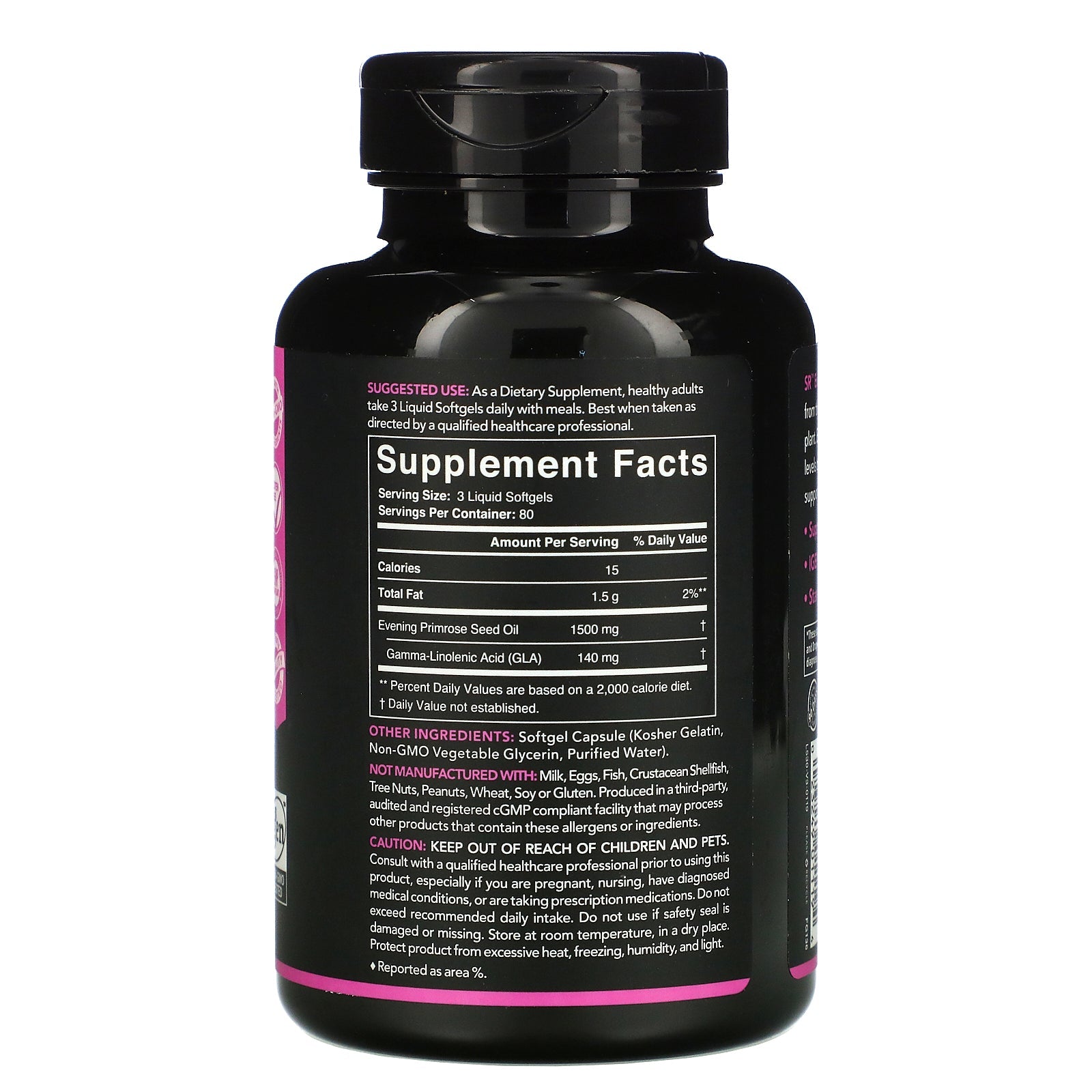 From Non-GMO Cold-Pressed Oil Dietary Supplement Made with Non-GMO Ingredients Gluten Free GMP Certified - Good Manufacturing Practice 3rd Party Quality Tested SR™ Evening Primrose Oil is cold-pressed from the seeds of the evening primrose plant. Each softgel contains concentrated levels of GLA, a fatty acid which may help support dry skin and women's health. Supports Skin & Women's Health Igen™ Non-GMO Tested Standardized 10% GLA♦ ♦Reported as area %.Sugg. UseAs a Dietary Supplement, healthy adults take 3 Liquid Softgels daily with meals. Best when taken as directed by a qualified healthcare professional.Other IngredientsSoftgel capsule (kosher gelatin, non-GMO vegetable glycerin, purified water). Not manufactured with: Milk, eggs, fish, crustacean shellfish, tree nuts, peanuts, wheat, soy or gluten. Produced in a third party, audited and registered cGMP compliant facility that may process other products that contain these allergens or ingredients.Supplement FactsServing Size: 3 Liquid Softgels Servings Per Container: 80 Amount Per...