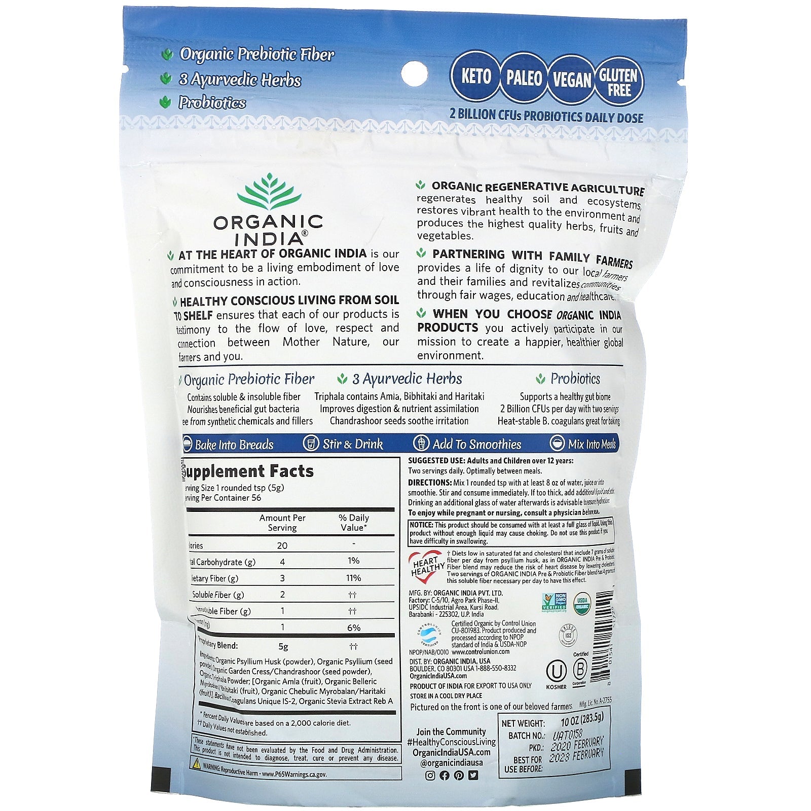 Prebiotic Fiber 3 Ayurvedic Herbs Probiotics Keto Paleo Vegan Gluten Free 2 Billion CFUs Probiotic Daily Dose Promotes Digestive Health Helps Maintain Regularity Supports Heart Health Lowers Cholesterol† Promotes Appetite Control Plus Rejuvenating Triphala Cleanses & Supports the GI Tract 5-in-1 Healthy Conscious Living 56 Servings Dietary Supplement USDA Kosher Non GMO Project Verified Heart Healthy Certified by Control Union Certified B Corporation At the heart of India is our commitment to be a living embodiment of love and consciousness in action. Healthy conscious living from soil to shelf ensure that each of our products is testimony to the flow of love, respect and connection between Mother Nature, our farmers and you. regenerative agriculture regenerates healthy soil and ecosystems, restores vibrant health to the environment and produces the highest quality herbs, fruits and vegetables. Partnering with family farmers provides a life of dignity to our local farmers and their families and revitalizes communities through fair wages, education and healthcare. When you choose India products you actively participate in our mission to create a happier, healthier global environment. Prebiotic Fiber Contains soluble & insoluble fiber. Nourishes beneficial gut bacteria. Free from synthetic chemical and fillers 3 Ayurvedic Herbs Triphala contains Amla, Bibhitaki and Haritaki. Improves digestion & nutrient assimilation. Chandrashoor seeds to soothe irritation. Probiotics Supports a healthy gut biome. 2 billion CFUs per day with two servings. Heat-stable B. coagulans great for baking. Heart Healthy †Diets low in saturated fat and cholesterol that include 7 grams of soluble fiber per day from psyllium husk, as in India Pre & Prebiotic Fiber blend may reduce the risk of heart disease by lowering cholesterol. Two servings of India Pre & Prebiotic Fiber blend has 4 grams of this soluble fiber necessary per day to have this effect.