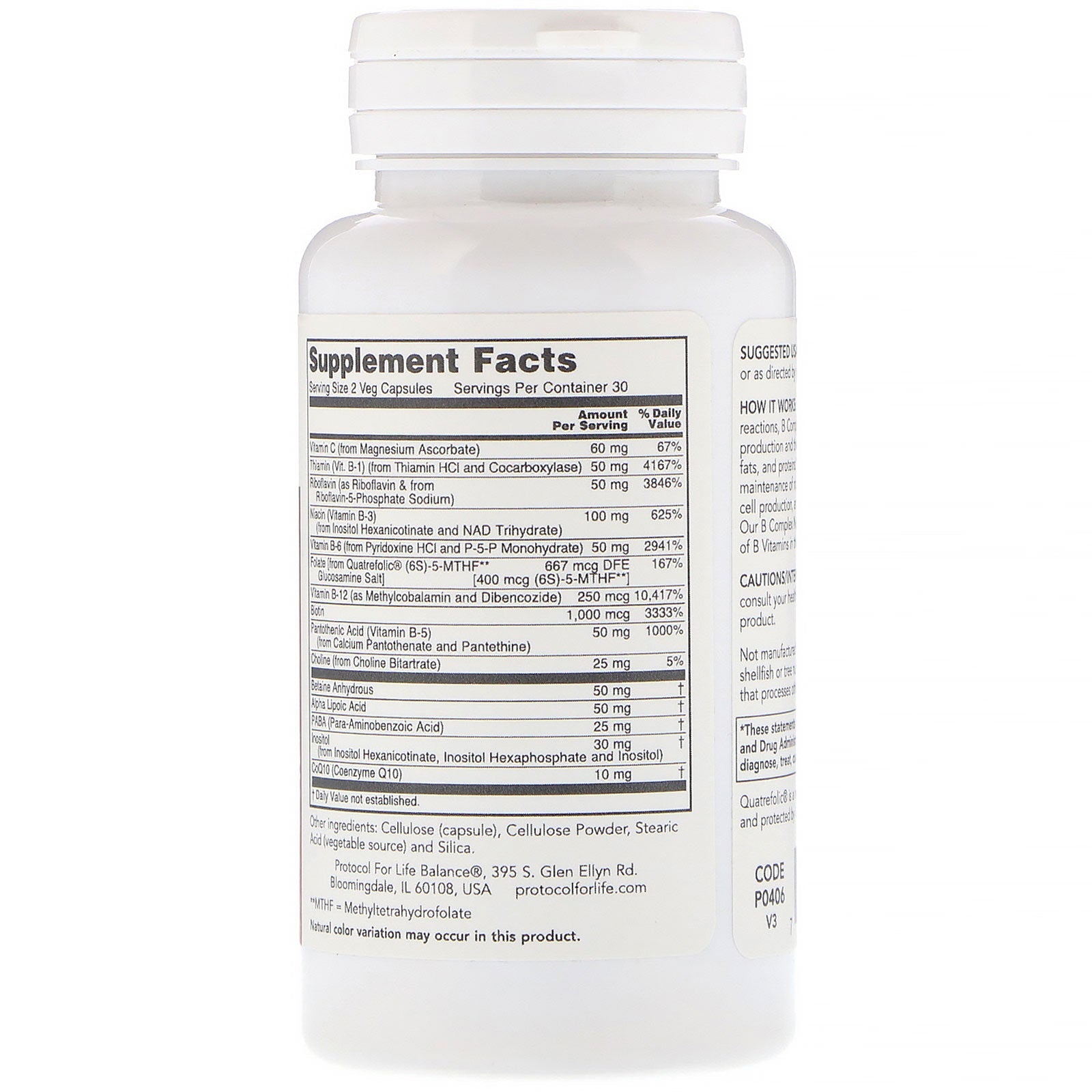 Serving Size: 2 Veg Capsules Servings Per Containe r: 30 Amount Per Serving %Daily Value Vitamin C (from Magnesium Ascorbate) 60 mg 67% Thiamin (Vit. B-1) (from Thiamin HCl and Cocarboxylase) 50 mg 4167% Riboflavin (as Riboflavin & from Riboflavin-5-Phosphate Sodium) 50 mg 3846% Niacin (Vitamin B-3) (from Inositol Hexanicotinate and NAD Trihydrate) 100 mg 625% Vitamin B-6 (from Pyridoxine HCl and P-5-P Monohydrate) 50 mg 2941% Folate [from Quatrefolic (6S)-5-MTHF** Glucosamine Salt] 667 mcg DFE [400 mcg (6S)-5-MTHF**] 167% Vitamin B-12 (as Methylcobalamin and Dibencozide) 250 mcg 10,417% Biotin 1,000 mcg 3333% Pantothenic Acid (Vitamin B-5) (from Calcium Pantothenate and Pantethine) 50 mg 1000% Choline (from Choline Bitartrate) 25 mg 5% Betaine Anhydrous 50 mg † Alpha Lipoic Acid 50 mg † PABA (Para-Aminobenzoic Acid) 25 mg † Inositol (from Inositol Hexanicotinate, Inositol Hexaphosphate and Inositol) 30 mg † CoQ10 (Coenzyme Q10) 10 mg † †Daily Value not established. **MTHF - MethyltetrahydrofolateDisclaimer