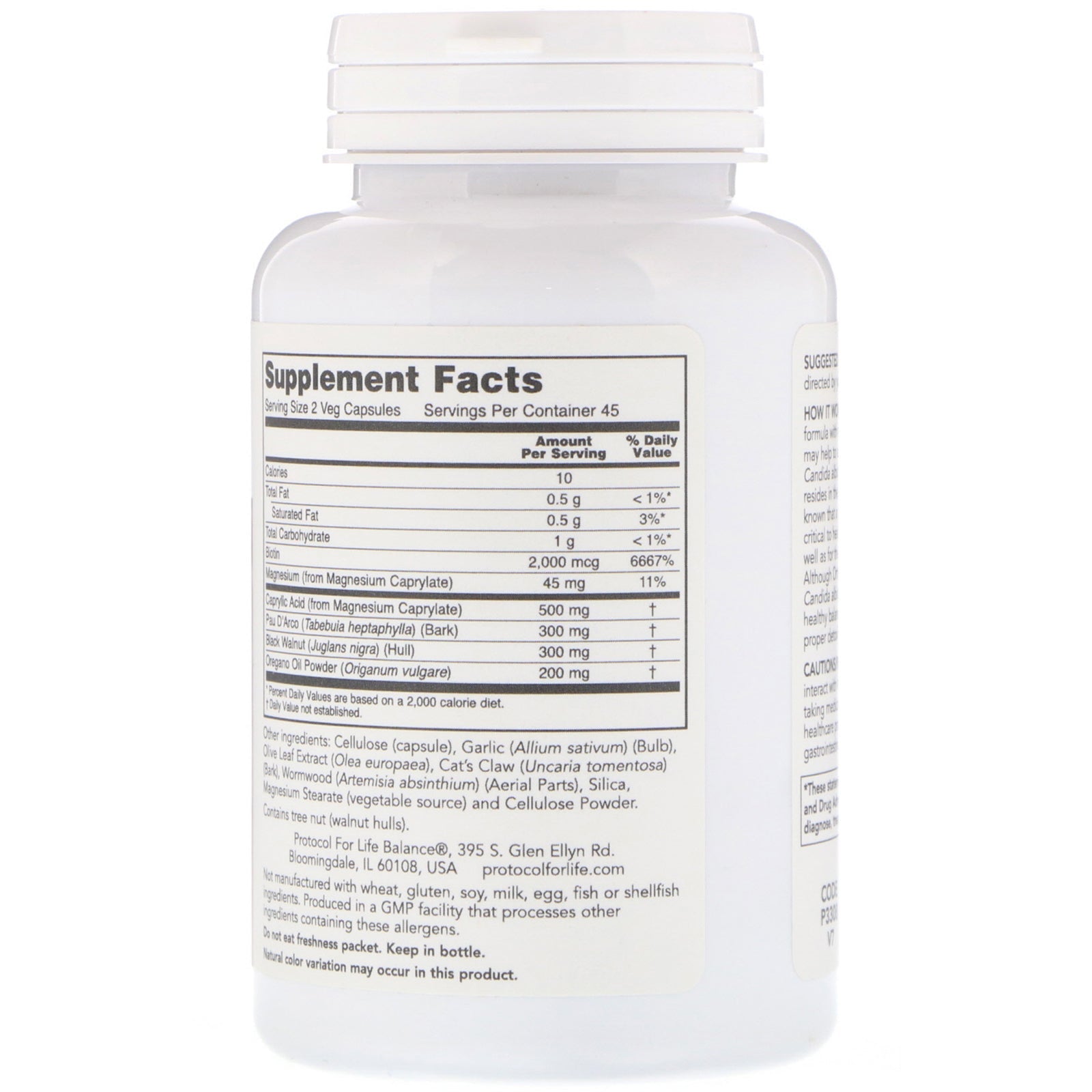 Serving Size: 2 Veg Capsules Serving Per Container: 45 Amount Per Serving %Daily Value Calories 10 Total Fat 0.5 g < 1%* Saturated Fat 0.5 g 3%* Total Carbohydrate 1 g < 1%* Biotin 2,000 mg 6667% Magnesium (from Magnesium Caprylate) 45 mg 11% Caprylic Acid (from Magnesium Caprylate) 500 mg † Pau D'Arco (Tabebuia heptaphylla) (Bark) 300 mg † Black Walnut (Juglans nigra) (Hull) 300 mg † Oregano Oil Powder (Origanum vulgare) 200 mg † *Percent Daily Values are based on a 2,000 calorie diet. † Daily Value not establishedDisclaimer
