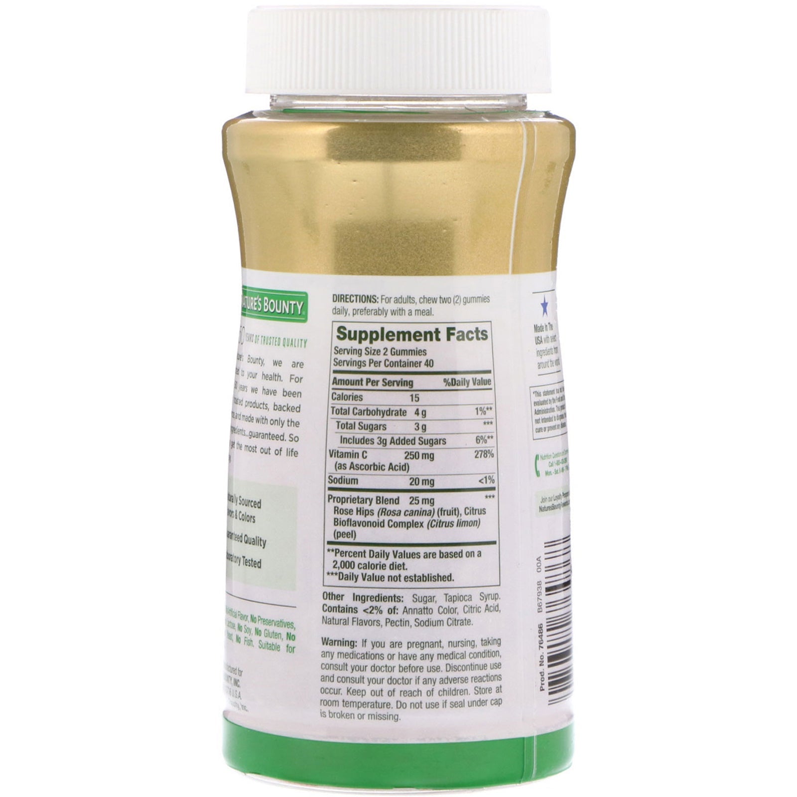 250 mg of Vitamin C With Rose Hips and Bioflavonoids Per Serving Supports a Healthy Immune System Immune Health Vitamin Supplement Orange Flavored Gummies Naturally Sourced Flavors & Colors Guaranteed Quality Laboratory Tested Nearly 50 Years of Trusted Quality At Nature's Bounty, we are committed to your health. For nearly 50 years we have been making trusted products, backed by science, and made with the only the purest ingredients...guaranteed. So you can get the most out of life every day.Sugg. UseFor adults, chew two (2) gummies daily, preferably with a meal.Other IngredientsSugar, tapioca syrup. Contains <2% of: Annatto color, citric acid, natural flavors, pectin, sodium citrate. Non-GMO, no artificial flavor, no preservatives, no milk, no lactose, no soy, no gluten, no wheat, no yeast, no fish. Suitable for vegetarians.Supplement FactsServing Size: 2 Gummies Serving Per Container: 40 Amount Per Serving %Daily Value Calories 15 Total Carbohydrate 4 g 1%** Total...