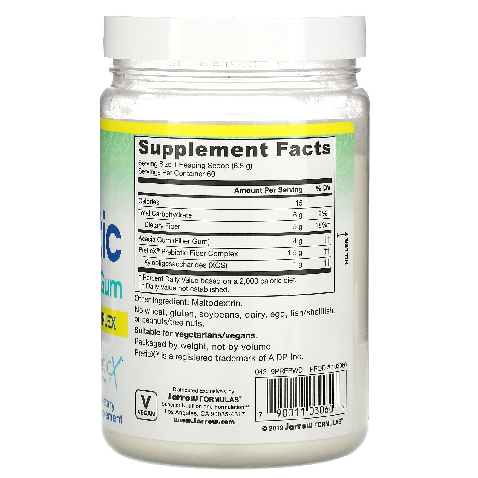Prebiotic Fiber Complex Enriches and Nourishes the Gut Microbiome PreticX - Optimize Your Flora Dietary Supplement Suitable for Vegetarians/Vegans Beneficial bacteria can be reduced by low-fiber diets, high meat diets, antibiotic use, travel and stress. Jarrow Formulas XOS + Acacia Gum primarily supports the growth of Bifidobacteria, but also Lactobacilli, for intestinal and immune function. PreticX XOS (XyloOligoSaccharides) has been shown in clinical studies to promote the growth of Bifidobacteria.Sugg. UseMix 1 heaping scoop with 4-6 oz. of water, juice or other beverages. Powder mixes best when the liquid is added on top of dry powder, or if stirred while adding powder to your beverage. Take 1 to 2 times per day along with your favorite Jarrow Formulas Probiotic or as directed by your qualified healthcare professional.Other IngredientsMaltodextrin. No wheat, gluten, soybeans, dairy, egg, fish/shellfish, or peanuts/tree nuts.Supplement FactsServing Size: 1 Heaping Scoop (6.5 g) Serving Per Container: 60 Amount...