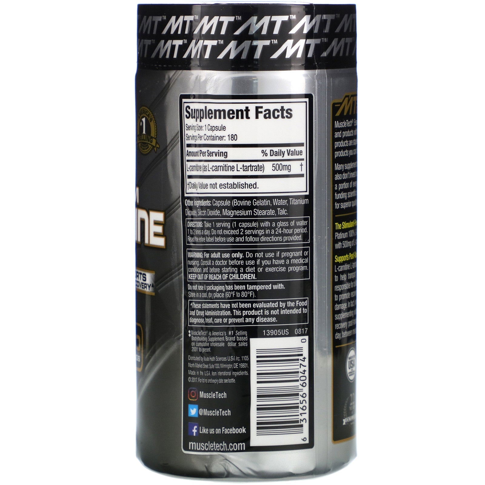 Research & Development Essential Series America's #1 Selling - Bodybuilding Supplement Brand ‡ 100% Pure Carnitine Formula 500 mg L-Carnitine The Most Studied Form of L-Carnitine Supports Muscle Recovery 180 Servings 1 Soft Gel Serving Scientifically Developed Based on Leading University Research #1 Most Award Winning- Sports Nutrition Brand #1 Fastest Growing- Sports Nutrition Brand- Total Average Yearly Sales Growth Since 1995 20 Years of Excellence U.S Military #1 Selling Bodybuilding Supplement Brand- Cumulative Sales #1 Most Clinical Studies in Science Formulated With Clinically Dosed Key Ingredients No. 1 Patents- Most Patents Awarded & Pending cGMP Manufactured- Manufactured According to cGMP Standard's, as Required for All Dietary Supplements Guaranteed Banned Substance Free Fully Disclosed Ingredients- No Proprietary Blends MT The Most Powerful Supplements On Earth At MuscleTech, our researchers are passionate about supplements. Our mission is to develop the most scientifically advanced and effective supplements to help you build muscle and strength, lose weight, and improve athletic performance. Thanks to our millions of loyal customers, we are fortunate to be the most-awarded and best-selling sports nutrition brand over the past 20 years. Many supplement companies don't disclose their ingredients, and don't invest in science, research, or quality control. We are different, MuscleTech invests millions in product research and development, and quality control - and our supplement facts always tell you exactly what you are getting: The Most Powerful Supplements on Earth! MuscleTech is the Leader in Science with a Multi-Million Dollar Research Budget- A portion of every dollar spent on MuscleTech supplements is allocated toward scientific research to discovery new and more effective ways to increase lean muscle and strength, and improve athletic performance. In fact, Team MuscleTech researchers have collaborated with researchers at over 20 universities and research facilities around the world to study the various key ingredients found in our powerful formulas. Platinum 100% Carnitine - Platinum 100% Carnitine supplies the most researched form of L-carnitine, L-carnitine, L-tartrate, which is an amino acid metabolite that acts as a co-factor to help transport fatty acids to the mitochondria. Mitochondria are responsible for cellular energy production. L-carnitine has been shown to promote recovery following resistance exercise by minimizing muscle damage. In fact, in recent clinical research at a leading university, subjects supplementing with just 1 g of L-carnitine experienced improved muscle recovery post-training. What's more, the non-stimulant properties of Platinum 100% Carnitine make it the perfect addition to your favorite diet supplement stack! ‡ MuscleTech is America's #1 Selling Bodybuilding Supplement Brand based on cumulative wholesale dollar sales 2001 to present.