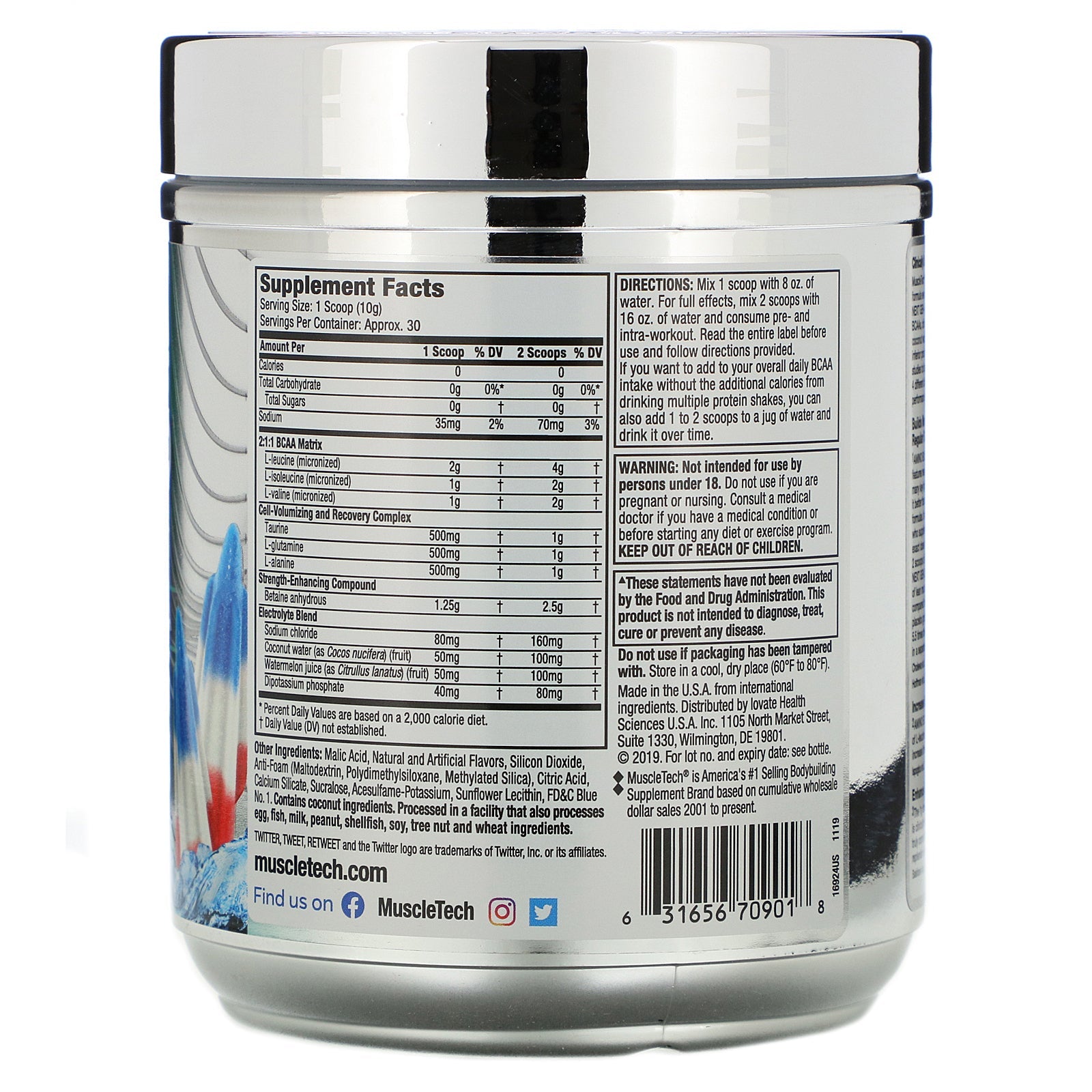 Serving Size: 1 Scoop (9 g) Servings Per Container: Approx. 30 Amount Per Serving (1 Scoop) %Daily Value (1 Scoop) Amount Per Serving (2 Scoops) %Daily Value (2 Scoops) Calories 25 50 Total Carbohydrate 1 g <1%* 2 g 1%* Sugars 0 g † 0 g † Sodium 35 mg 1% 70 mg 3% Potassium (as dipotassium phosphate) 18 mg 1% 36 mg 1% 2:1:1 BCAA Matric L-leucine (micronized) 2 g † 4 g † L-isoleucine (micronized) 1 g † 2 g † L-valine (micronized) 1 g † 2 g † Cell-Volumizing and Recovery Complex Taurine 500 mg † 1 g † L-glutamine 500 mg † 1 g † L-alanine 500 mg † 1 g † Strength-Enhancing Compound Betaine anhydrous 1.25 g † 2.5 g † Electrolyte Blend Sodium chloride 80 mg † 160 mg † Coconut water (as Cocos nucifera) (fruit) 50 mg † 100 mg † Watermelon juice (as Citrullus lanatus) (fruit) 50 mg † 100 mg † Dipotassium phosphate 40 mg † 80 mg † *Percent Daily Values are based on a 2,000 calorie diet. †Daily Value not established.Disclaimer