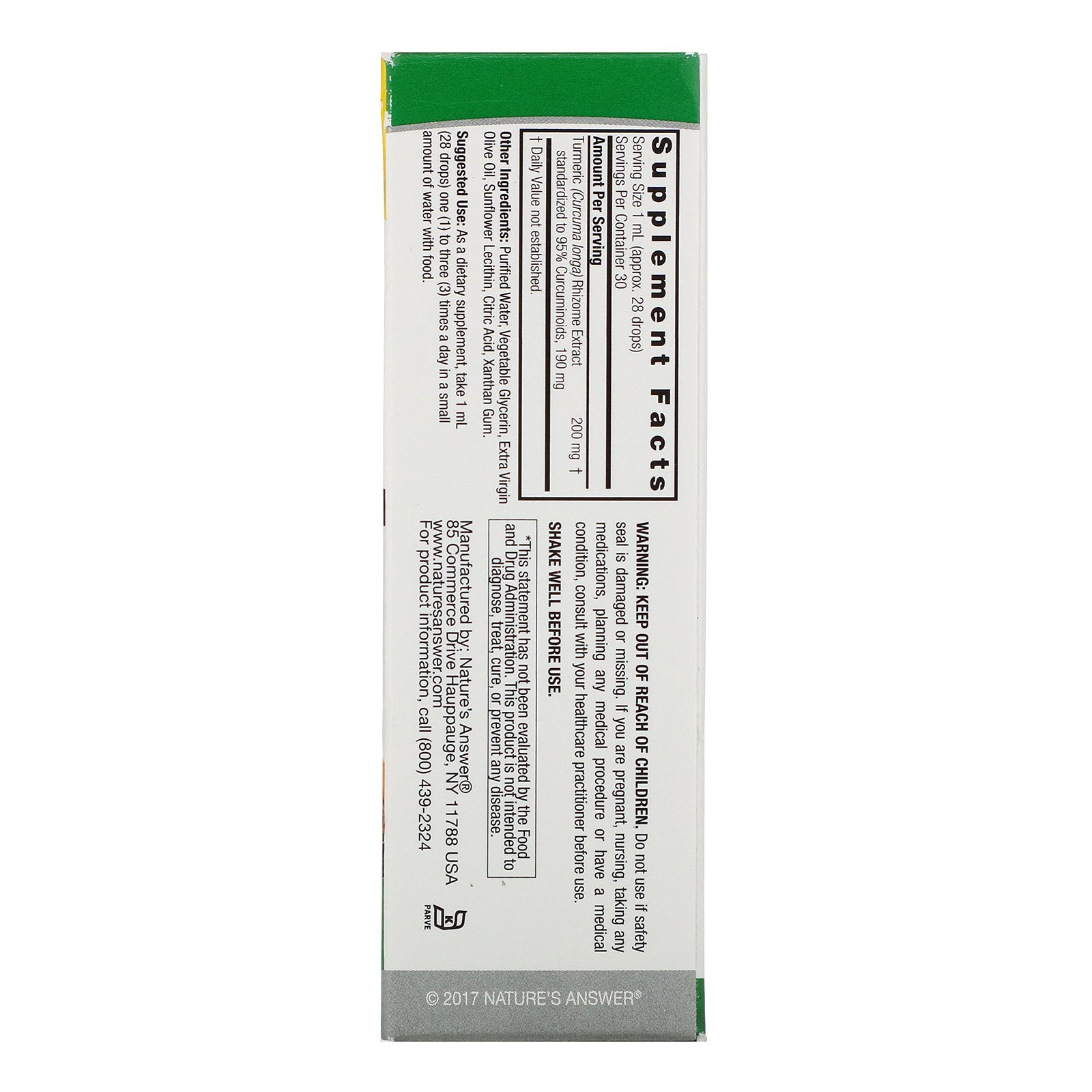 Serving Size: 1 mL (approx. 28 drops) Servings Per Container: 30 Amount Per Serving % Daily Value* Turmeric (curcuma longa) Rhizome Extract (standardized to 95% Curcuminoids, 190 mg 200 mg † †Daily Value not established.Disclaimer