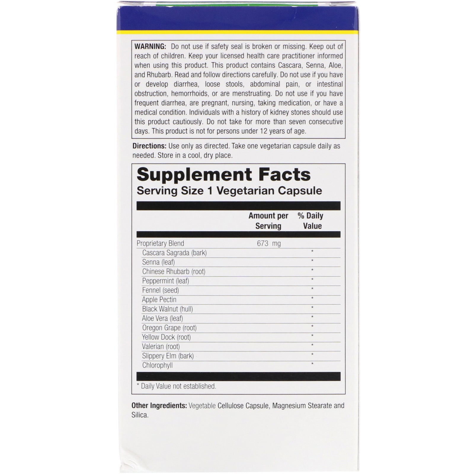 Serving Size 1 Vegetarian Capsule Amount Per Serving % Daily Value Proprietary Blend 673 mg Cascara Sagrada (bark) * Senna (leaf) * Chinese Rhubarb (root) * Peppermint (leaf) * Fennel (seed) * Apple Pectin * Black Walnut (hull) * Aloe Vera (leaf) * Oregon Grape (root) * Yellow Dock (root) * Valerian (root) * Slippery Elm (bark) * Chlorophyll * * Daily Value not established.Disclaimer