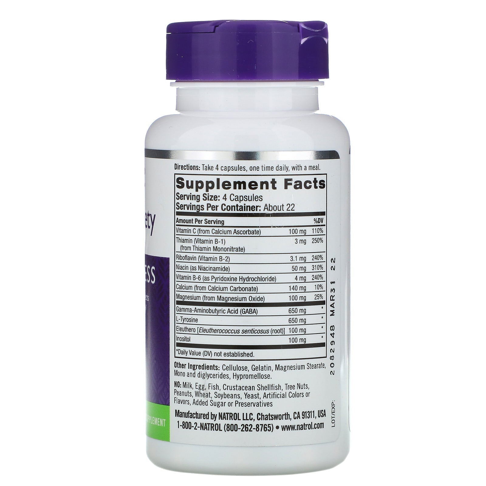 Mood & Stress Helps Reduce & Combat the Effects of Occasional Stress & Anxiety Promotes Relaxation Dietary Supplement Natrol Stress & Anxiety Formula: Patented formula with key nutrients to help reduce occasional stress and anxiety. Combats the effects of daily stress. 100% Drug-free and non-habit forming.Sugg. UseTake 4 capsules, one time daily, with a meal.Other IngredientsCellulose, gelatin, magnesium stearate, mono and diglycerides, hypromellose. No: Milk, egg, fish, crustacean shellfish, tree nuts, peanuts, wheat, soybeans, yeast, artificial colors or flavors, added sugar or preservatives.Supplement FactsServing Size: 4 Capsules Servings Per Container: About 22 Amount Per Serving %DV Vitamin C (from Calcium Ascorbate) 100 mg 110% Thamin (Vitamin B-1) (from Thiamin Mononitrate) 3 mg 250% Riboflavin (Vitamin B-2) 3.1 mg 240% Niacin (as Niacinamide) 50 mg 310% Vitamin B-6 (as Pyridoxine Hydrochloride) 4 mg 240% Calcium (from Calcium Carbonate) 140 mg 10% Magnesium (from Magnesium Oxide) 100 mg 25% Gamma-Aminobutyric Acid (GABA)...