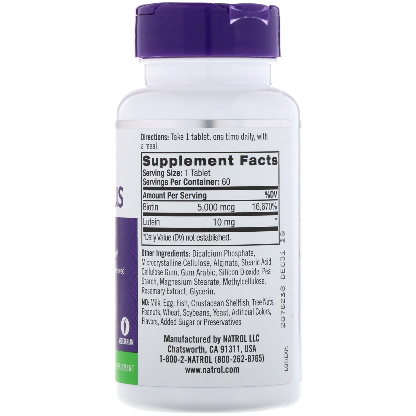 Promotes Healthy Hair, Skin & Nails Plus Clinical Strength Lutein for Improved Skin Elasticity & Hydration Vegetarian Dietary Supplement Natrol Biotin Plus with Lutein: 10 mg Lutein - clinical strength skincare shown to improve skin elasticity and hydration when taken daily. 5,000 mcg Biotin - supports healthy hair, radiant skin and stronger nails. Helps support energy metabolism and aids in the conversion of food into energy. Clinical studies have shown that those deficient in Biotin can experience hair loss and brittle nails.Sugg. UseTake 1 tablet, one time daily, with a meal.Other IngredientsDicalcium phosphate, microcrystalline cellulose, alginate, stearic acid, cellulose gum, gum arabic, silicon dioxide, pea starch, magnesium stearate, methylcellulose, rosemary extract, glycerin. No: Milk, egg, fish, crustacean shellfish, tree nuts, peanuts, wheat, soybeans, yeast, artificial colors, added sugar or preservatives.Supplement FactsServing Size: 1 Tablet Servings Per Container: 60 Amount Per Serving %DV Biotin 5,000 mcg 16,670% Lutein 10 mg *...