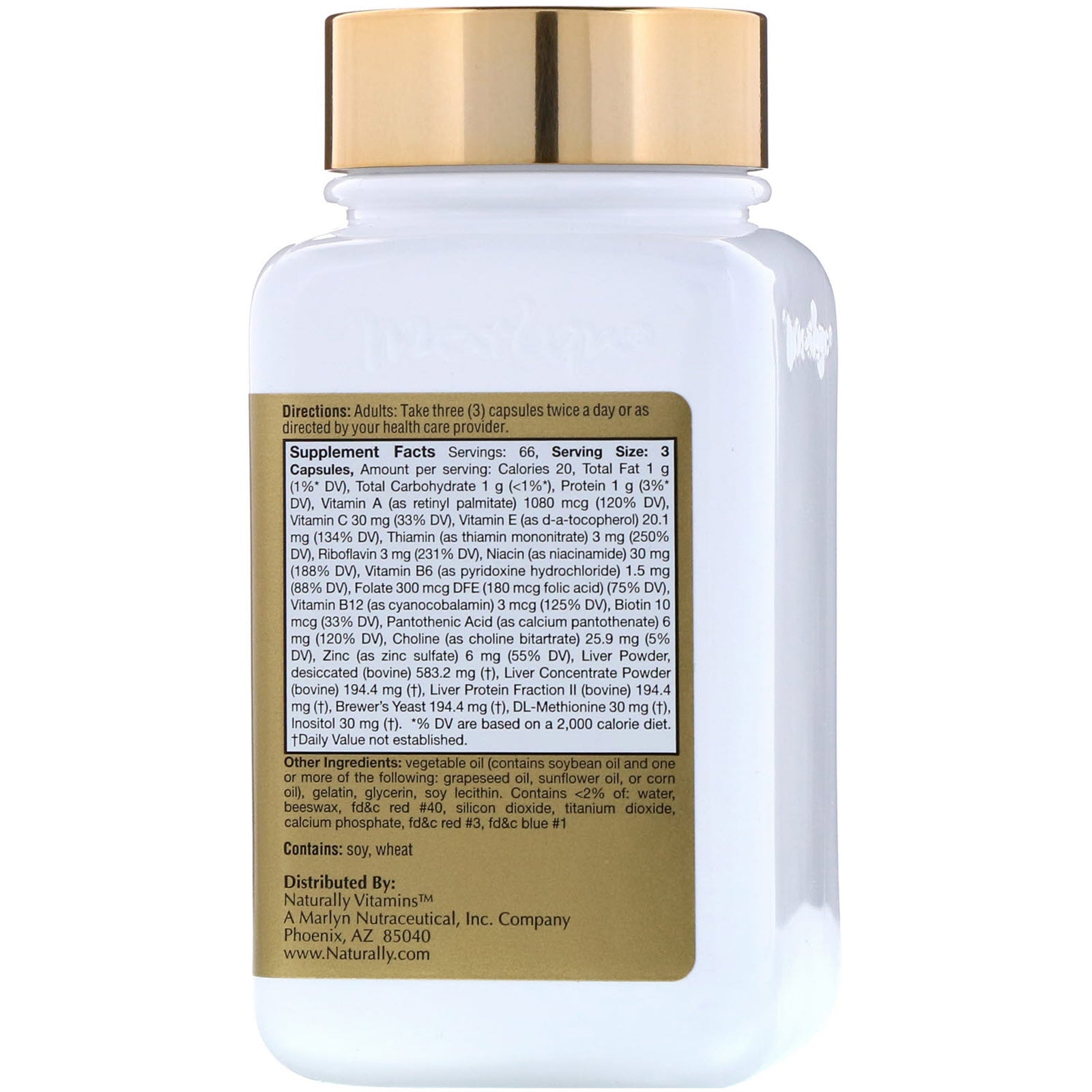 Hepatic-Lipotropic Support Supplement Marlyn's Hep-Forte is a dietary lipotropic and nutritional support supplement to help maintain healthy liver function. For use as a dietary supplement for liver function support and Vitamin B insufficiency.Sugg. UseAdults: Take three (3) capsules twice a day or as directed by your health care provider.Other IngredientsVegetable oil (contains soybean oil, and one or more of the following: grapeseed oil, sunflower oil, or corn oil), gelatin, glycerin, soy lecithin. Contains <2% of: water, beeswax, fd&c red #40, silicon dioxide, titanium dioxide, calcium phosphate, fd&c red #3, fd&c blue #1. Contains: Soy, wheat.Supplement FactsServing Size: 3 Capsules Serving Per Container: 66 Amount Per Serving %Daily Value Calories 20 Total Fat 1 g 1%* Total Carbohydrate 1 g <1%* Protein 1 g 3%* Vitamin A (as retinyl Palmitate) 1080 mcg 120% Vitamin C 30 mg 33% Vitamin E (d-a-tocopherol) 20.1 mg 134% Thiamin (as thiamin mononitrate) 3 mg 250%...