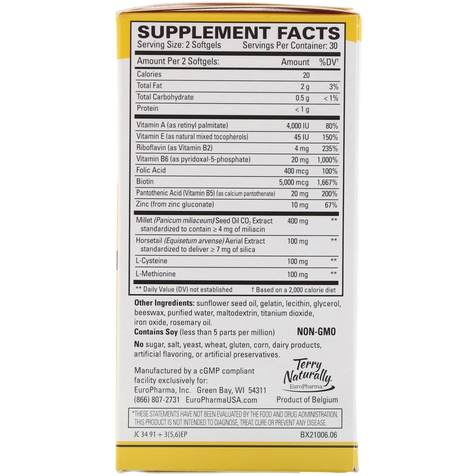 Serving Size: 2 Softgels Servings Per Container: 30 Amount Per 2 Softgels: Amount %DV† Calories 20 Total Fat 2 g 3% Total Carbohydrate 0.5 g <1% Protein <1 g Vitamin A (as retinyl palmitate) 4,000 IU 80% Vitamin E (as natural mixed tocopherols) 45 IU 150% Riboflavin (as Vitamin B2) 4 mg 235% Vitamin B6 (as pyridoxal-5-phosphate) 20 mg 1,000% Folic Acid 400 mcg 100% Biotin 5,000 mcg 1,667% Pantothenic Acid (Vitamin B5) (as calcium pantothenate) 20 mg 200% Zinc (from zinc gluconate) 10 mg 67% Millet (Panicum miliaceum) Seed Oil CO2 Extract standardized to contain≥4 mg of miliacin 400 mg ** Horsetail (Equisetum arvense) Aerial Extract standardized to deliver ≥7 mg of Silica 100 mg ** L-Cysteine 100 mg ** L-Methionine 100 mg ** ** Daily Value (DV) not established. †Based on a 2,000 calorie diet.Disclaimer