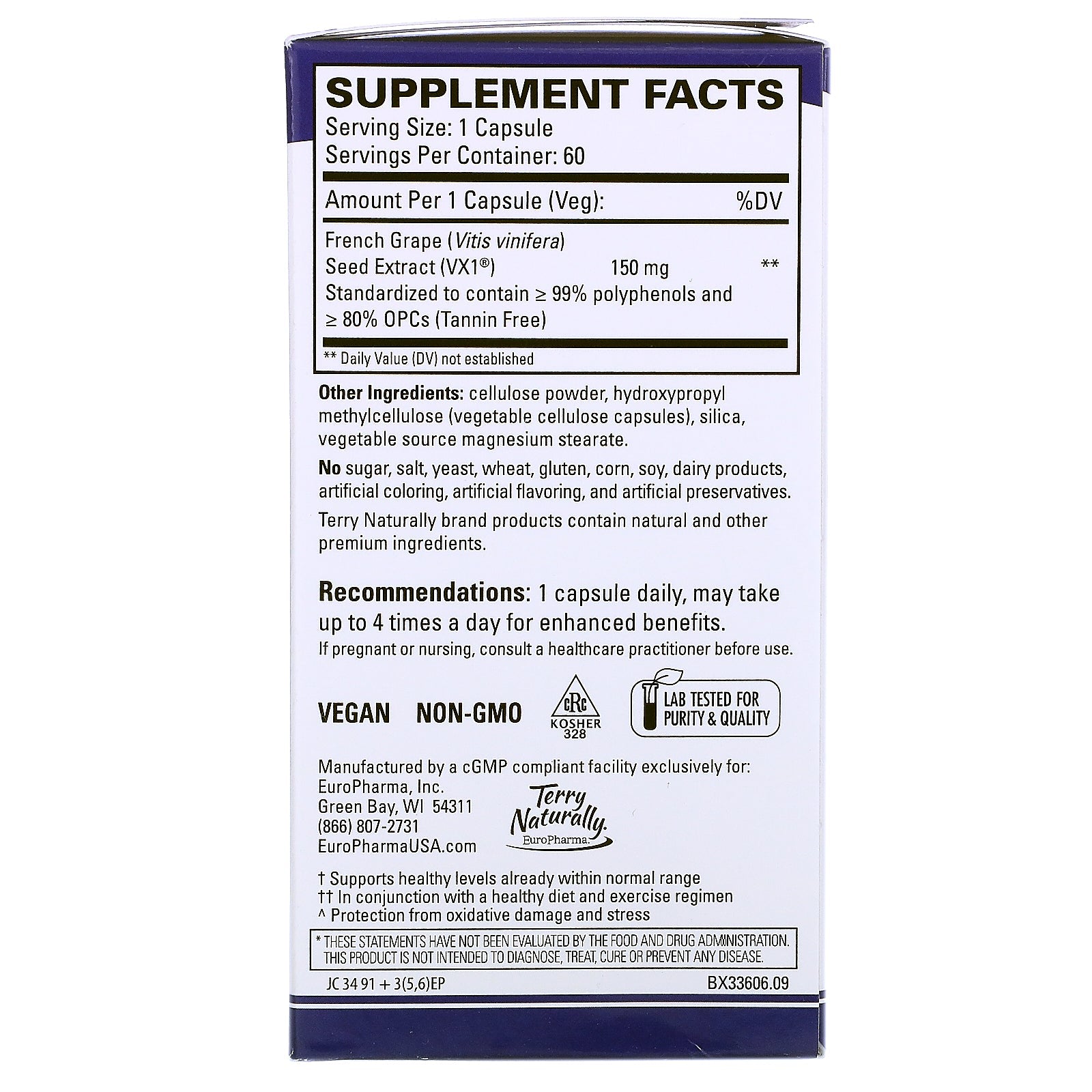 Serving Size: 1 Capsule Servings Per Container: 60 Amount Per Serving % DV French Grape (Vitis vinifera) Seed Extract (VX1 ® ) Standardized to contain ≥99% polyphenols and ≥ 80% OPCs (Tannin Free) 150 mg ** **Daily Value (DV) not established.Disclaimer
