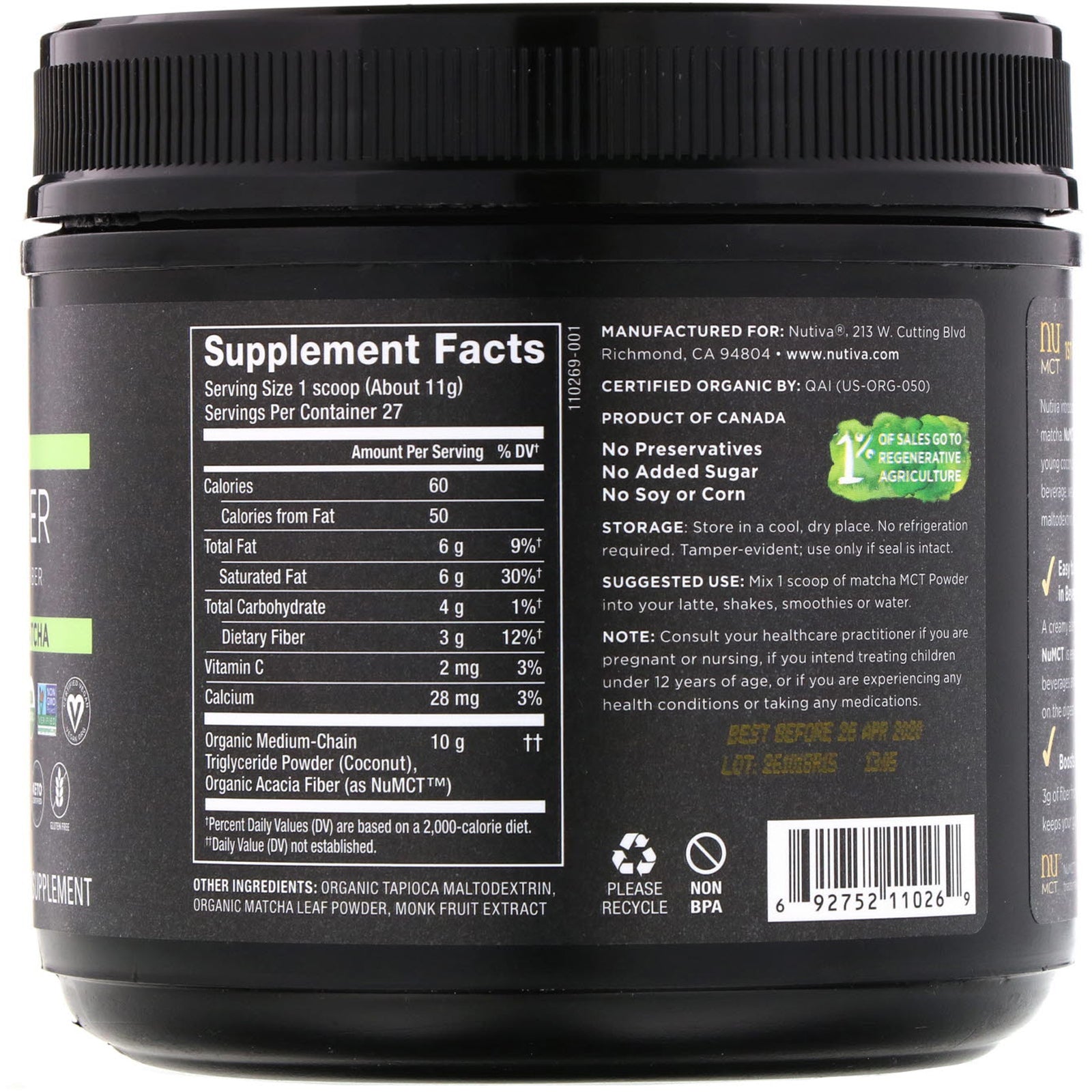 Nurture Vitality With Prebiotic Acacia Fiber Supports Ketogenic & Paleo Diets Ideal for Matcha Latte Contains Caffeine Kosher USDA Non GMO Project Verified Certified Vegan This Product is Keto Certified Gluten Free Dietary Supplement Certified by: QAI No Preservatives No Added Sugar No Soy or Corn Non BPA NU MCT 1st MCT Powder In The World! Nutiva introduces NuMCT™, a premium MCT oil powder, now in matcha. NuMCT™ starts with MCT oil made from coconut oil from young coconuts. To ensure that the quality fats blend perfectly into any beverage, we add prebiotic acacia fiber and a small amount of tapioca maltodextrin. Energize your day with Nutiva's matcha MCT powder! Easy to Digest & Soluble in Beverages A creamy alternative to MCT oil, NuMCT™ is easier to blend in beverages and is more gentle on the digestive system. Boosts Your Gut Health 3 g fiber from prebiotic acacia fiber keeps your gut happy and healthy. Quick & Sustained Ketogenic Fuel MCT powder is a form of digestible fatty acids that quickly convert to ketones, giving the brain, muscles and other tissues fast and sustained energy. Contains 16 mg of naturally occurring caffeine per serving. Use Any Time of Day Power the morning for enhanced mental clarity. Add to your favorite beverage or water for increased antioxidant intake and fuel for your day. Before workout for energy boost and increased performance. After meals to maintain a ketogenic diet. Medium-Chain Triglycerides (MCT) typically contain: C8 56% Caprylic Acid C10 39% Capric Acid C12 5% Lauric Acid