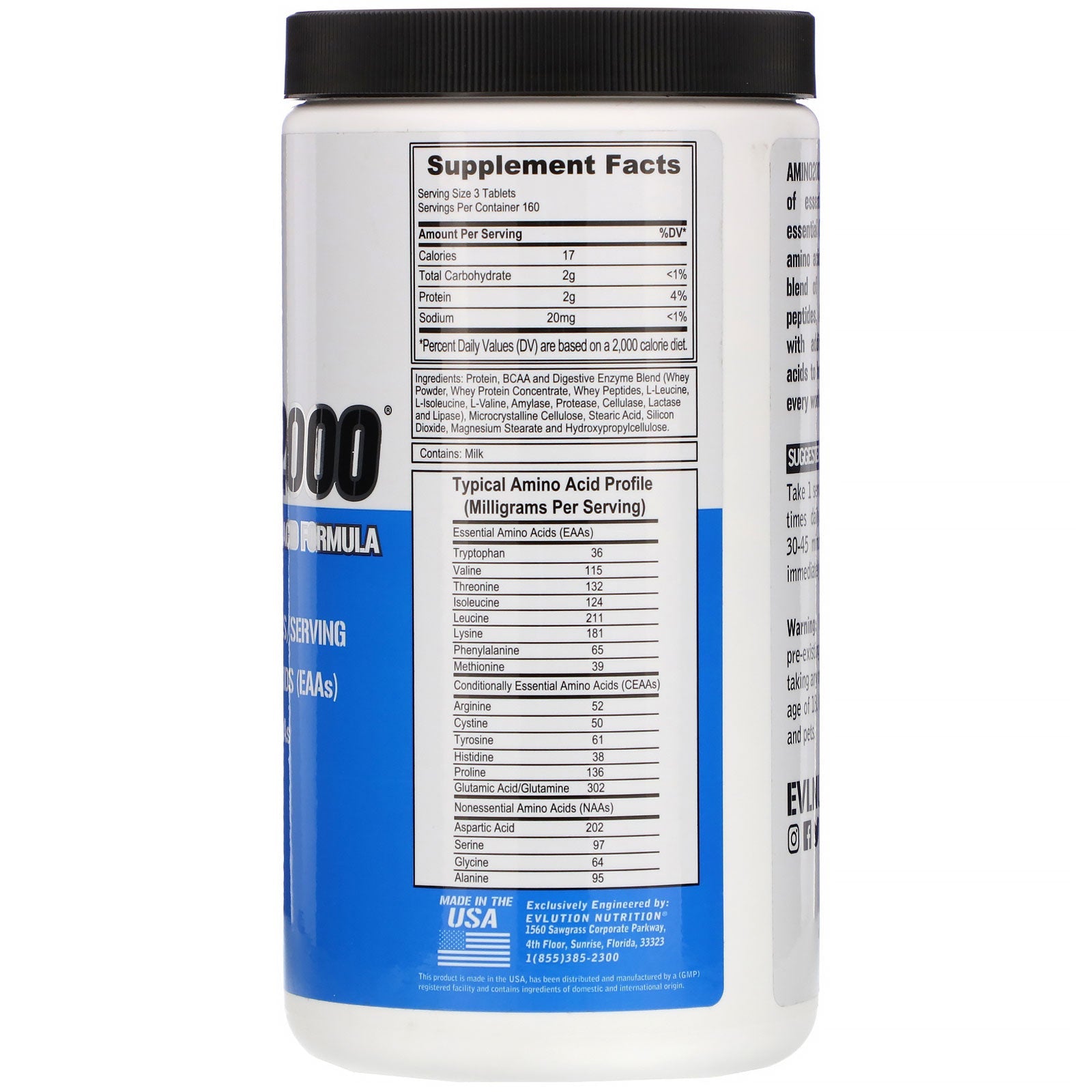 2000 mg Amino Acids/Serving Essential Amino Acids (EAAs) Ultra Premium BCAAs Gluten Free 160 Servings Dietary Supplement Amino2000® offers a full spectrum of essential (EAAs), conditionally essential (CEAAs), and non-essential amino acids (NAAs). Derived from a blend of whey protein and whey peptides, Amino2000® is fortified with additional micronized amino acids to help you make the most of every workout!Sugg. UseTake 1 serving of Amino2000® 1 to 3 times daily. Consume between meals, 30-45 minutes before workouts, and/or immediately after workouts.Other IngredientsProtein, bcaa and digestive enzyme blend (whey powder, whey protein concentrate, whey peptides, l-leucine, l-isoleucine, l-valine, amylase, protease, cellulase, lactase and lipase), microcrystalline cellulose, stearic acid, silicon dioxide, magnesium stearate and hydroxypropylcellulose. Contains: Milk This product is made in the USA, had been distributed and manufactured by a (GMP) registered facility and contains ingredients of domestic and international origin.Supplement FactsServing Size: 3 Tablets Servings Per Container: 160 Amount Per...