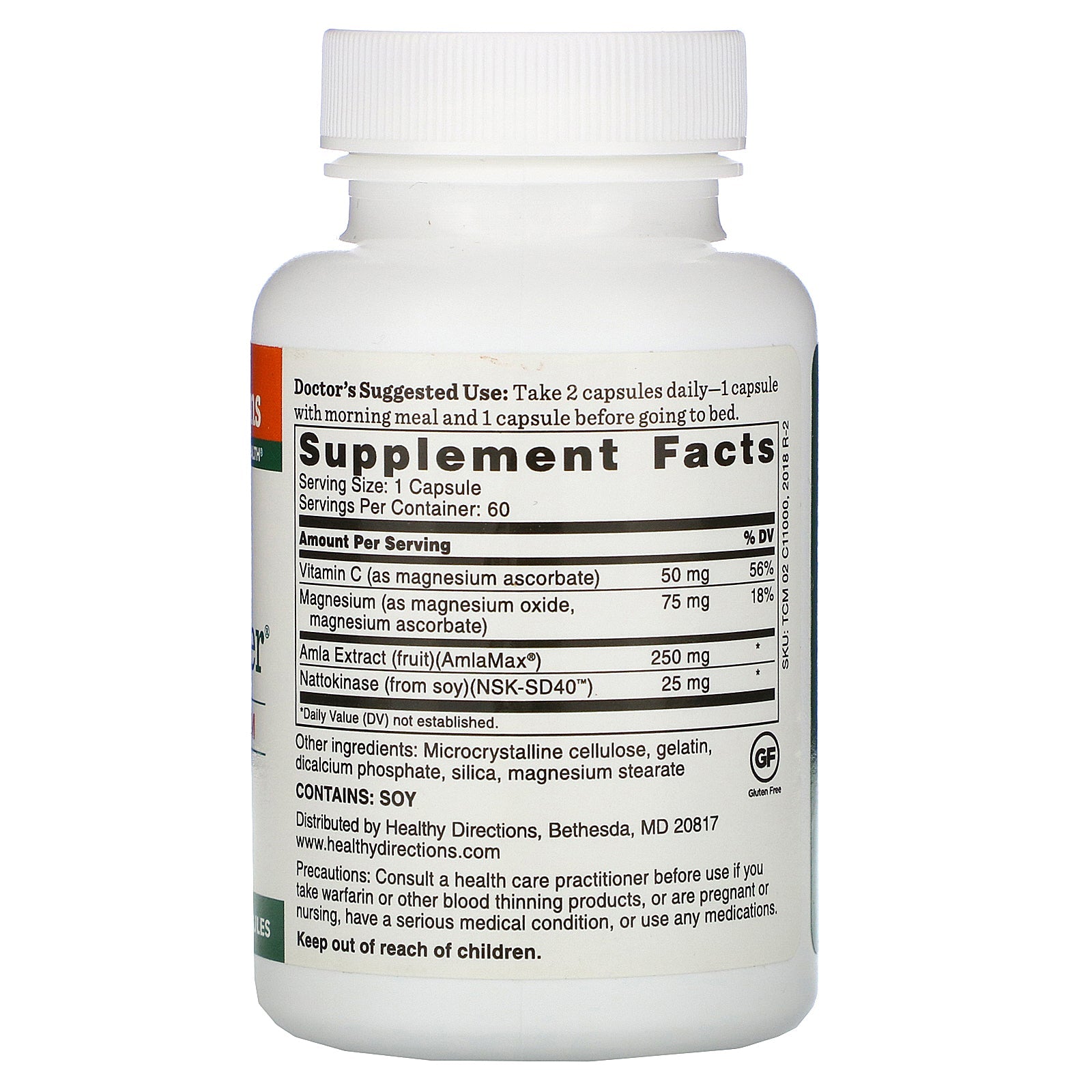 Searching the World For Better Health® Promotes Cellular Energy and Cardiovascular Health Dietary Supplement Gluten FreeSugg. UseTake 2 capsules daily-1 capsule with morning meal and 1 capsule before going to bed. Each capsule provides 1,000 FU (fibrin units) of nattokinase activity.Other IngredientsMicrocrystalline cellulose, gelatin, dicalcium phosphate, silica, magnesium stearate. Contains: SoySupplement FactsServing Size: 1 Capsule Servings Per Container : 60 Amount Per Serving %Daily Value Vitamin C (as magnesium ascorbate) 50 mg 56% Magnesium (as magnesium oxide, magnesium ascorbate) 75 mg 18% Amla Extract (fruit)(AmlaMax ®) 250 mg * Nattokinase (from soy)(NSK-SD40 ™) 25 mg * *Daily Value (DV) not established.DisclaimerWhile VitaminsUK strives to ensure the accuracy of its product images and information, some manufacturing changes to packaging and/or ingredients may be pending update on our site. Although items may occasionally ship with alternate packaging, freshness is always guaranteed. We recommend that you read labels, warnings and directions of all...
