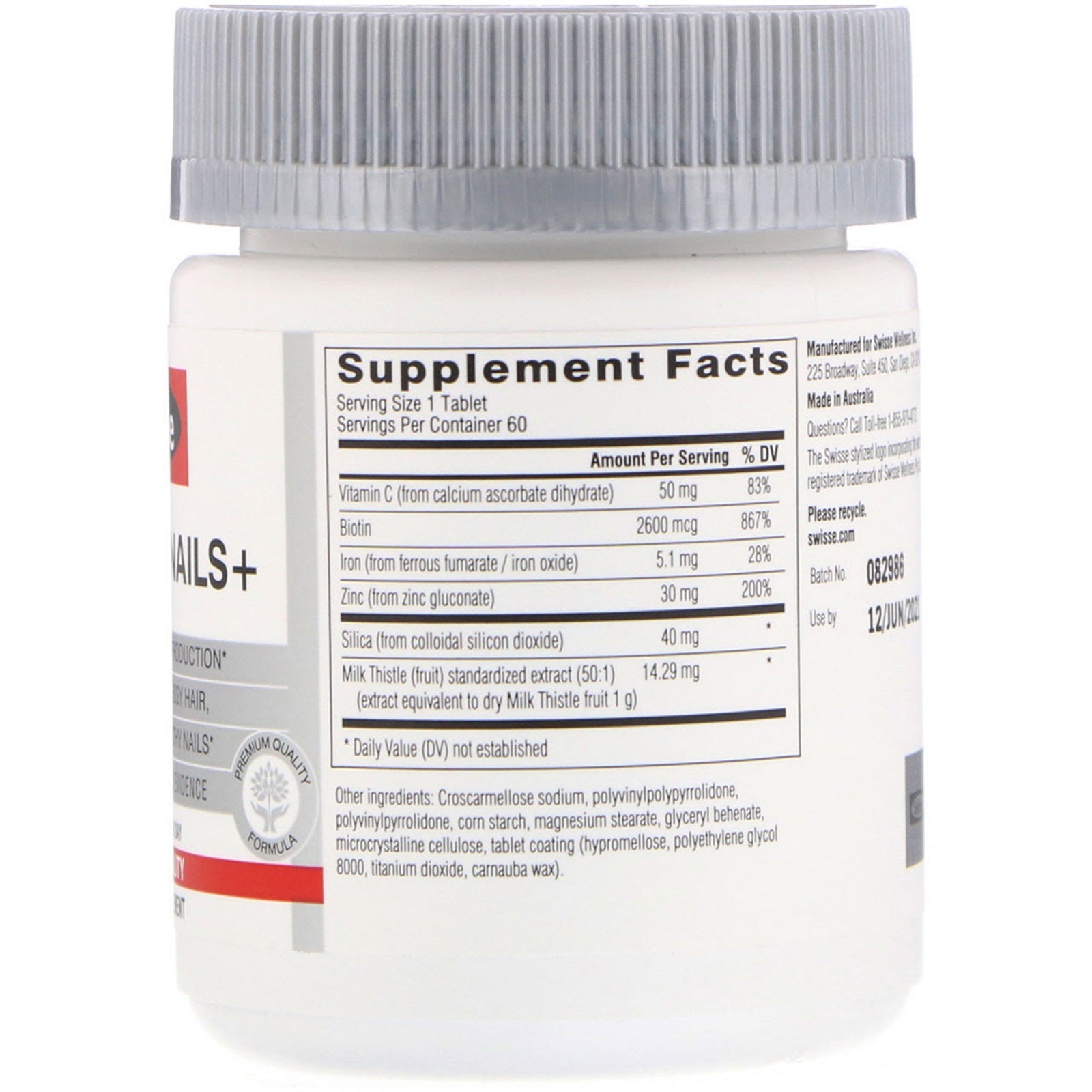 Serving Size: 1 Tablet Servings Per Container: 60 Amount Per Serving %Daily Value Vitamin C (from calcium ascorbate dihydrate) 50 mg 83% Biotin 2600 mcg 867% Iron (from ferrous fumarate/iron oxide) 5.1 mg 28% Zinc (from zinc gluconate) 30 mg 200% Silica (from colloidal silicon dioxide) 40 mg * Milk Thistle (fruit) standardized extract (50:1) (extract equivalent to dry Milk Thistle fruit 1 g) 14.29 mg * * Daily Value (DV) not establishedDisclaimer