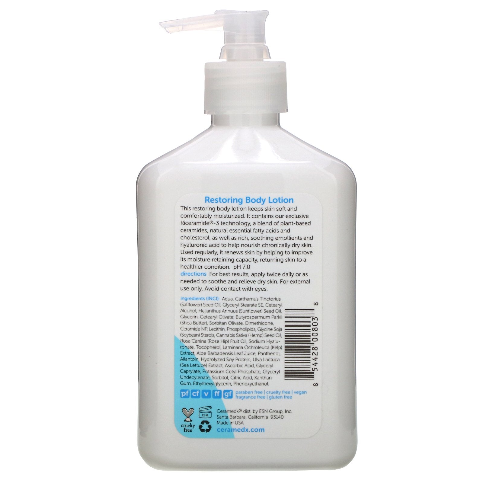 Earth Science Natural Ceramide Therapy With Riceramide®-3 Plant-Based Ceramide Technology Moisturizes and Restores Skin's Protective Barrier Effective Relief for Very Dry, Sensitive Skin Clinically Tested Dermatologist Recommended pH - 7.0 Paraben Free Cruelty Free Vegan Gluten Free This restoring body lotion keeps skin soft and comfortably moisturized. It contains our exclusive Riceramide®-3 technology, a blend of plant-based ceramides, natural essential fatty acids and cholesterol, as well as rich, soothing emollients and hyaluronic acid to help nourish chronically dry skin. Used regularly, it renews skin by helping to improve its moisture retaining capacity, returning skin to a healthier condition.Sugg. UseFor best results, apply twice daily or as needed to soothe and relieve dry skin.Other IngredientsAqua, carthamus tinctorius (safflower) seed oil, glyceryl stearate SE, cetearyl alcohol, helianthus annuus (sunflower) seed oil, glycerin, cetearyl olivate, butyrospermum parkii (shea butter), sorbitan olivate, dimethicone, ceramide NP, lecithin, phospholipids, glycine soja (soybean) sterols, cannabis sativa (hemp)...