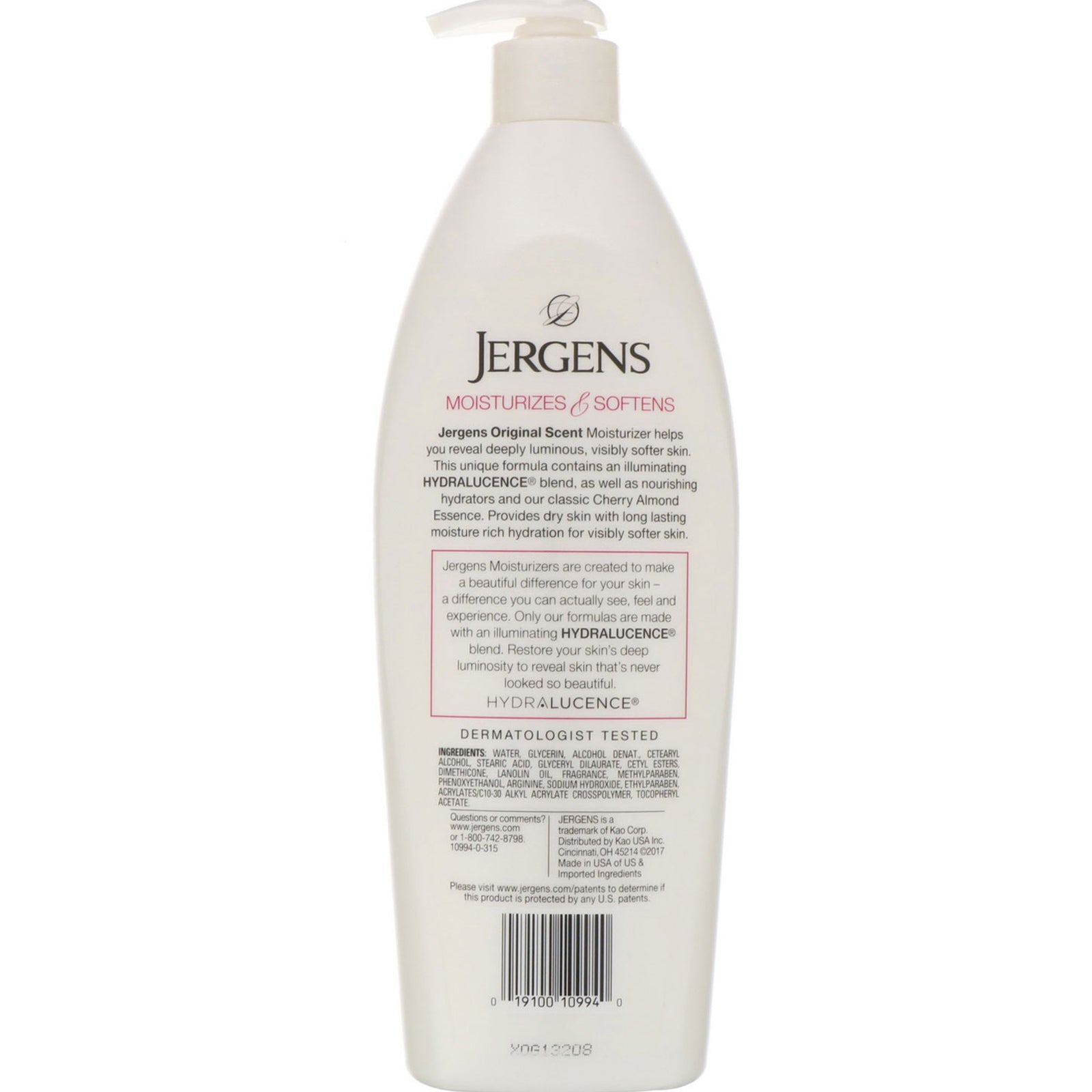 Long Lasting Moisture for Beautifully Soft Skin With Cherry Almond Essence Moisturizes & Softens Dermatologist Tested Jergens Original Scent Moisturizer helps you reveal deeply luminous, visibly softer skin. This unique formula contains an illuminating HYDRALUCENCE® blend, as well as nourishing hydrators and our classic Cherry Almond Essence. Provides dry skin with long lasting moisture rich hydration for visibly softer skin. Jergens Moisturizers are created to make a beautiful difference for your skin - a difference you can actually see, feel and experience. Only our formulas are made with an illuminating HYDRALUCENCE® blend. Restore your skin's deep luminosity to reveal skin that's never looked so beautiful. HYDRALUCENCE®.Sugg. UseOther IngredientsWater, glycerin, alcohol denat, cetearyl alcohol, stearic acid, glyceryl dilaurate, cetyl esters, dimethicone, lanolin oil, fragrance, methylparaben, phenoxyethanol, arginine, sodium hydroxide, ethylparaben, acrylates/c10-30 alkyl acrylate crosspolymer, tocopheryl acetate.Supplement FactsDisclaimerWhile VitaminsUK strives to ensure the accuracy of its product images and information, some manufacturing...