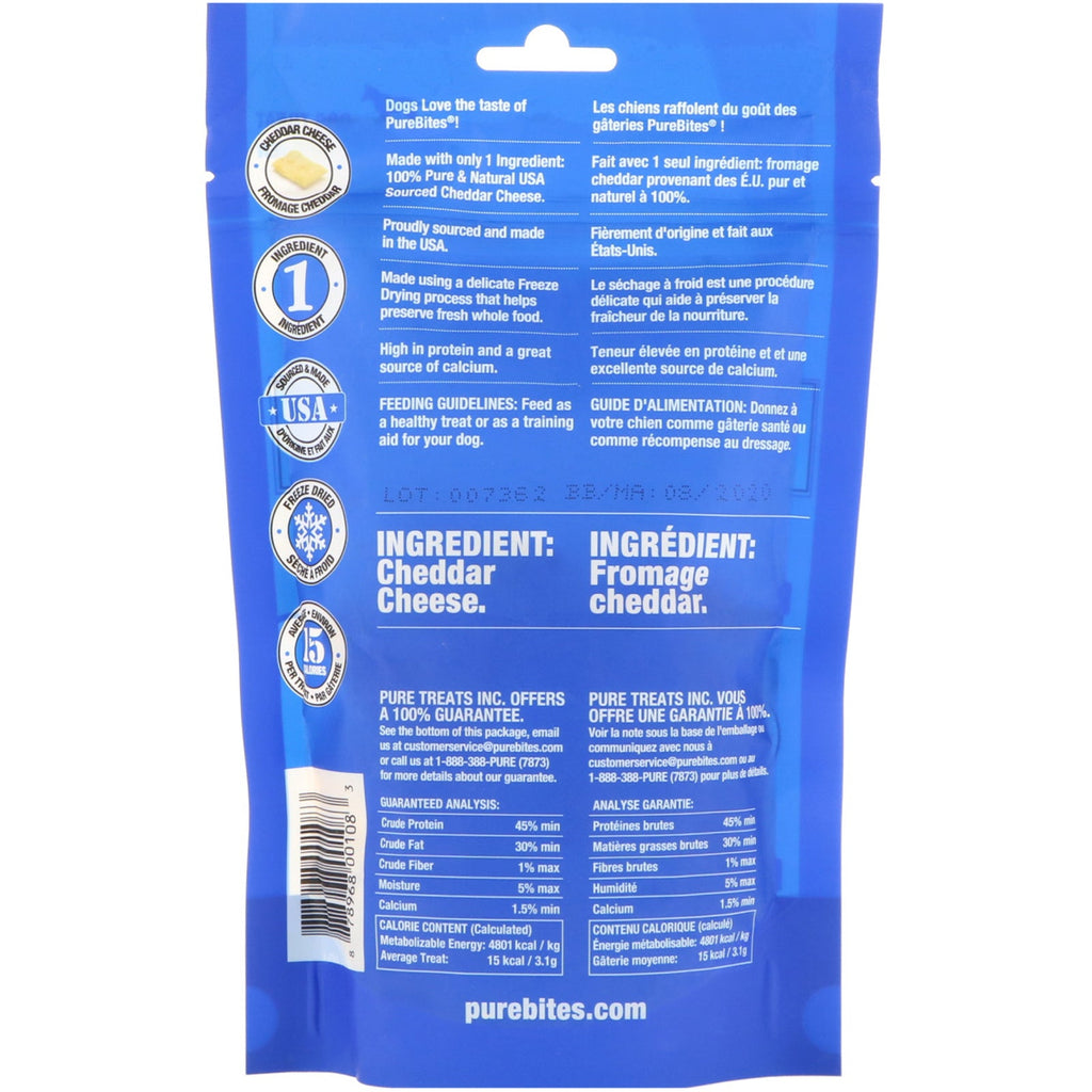 100% Natural Dogs Love the Taste of PureBites®! Made With Only 1 Ingredient: 100% Pure & Natural USA Sourced Cheddar Cheese Made Using a Delicate Freeze Drying Process That Helps Preserve Fresh Whole Food High in Protein and a Great Source of CalciumSugg. UseFeeding Guidelines: Feed as a healthy treat or as a training aid for your dog.Other IngredientsCheddar cheese.Supplement FactsDisclaimerWhile VitaminsUK strives to ensure the accuracy of its product images and information, some manufacturing changes to packaging and/or ingredients may be pending update on our site. Although items may occasionally ship with alternate packaging, freshness is always guaranteed. We recommend that you read labels, warnings and directions of all products before use and not rely solely on the information provided by VitaminsUK.