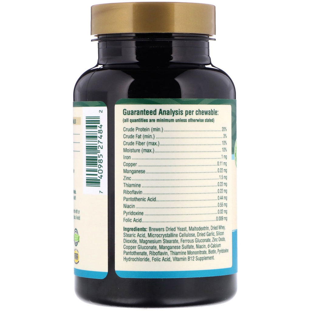 Veterinarian Formulated With B Vitamins, Garlic & Minerals Healthy Skin & Coat Support for Dogs All Dog Laboratory Tested - Guaranteed Quality Quality Seal NASC - National Animal Supplement CouncilSugg. UseDog Weight Number of Chewables Up to 10 lbs 1 Chewable Daily 11-20 lbs 2 Chewables Daily 21-30 lbs 3 Chewables Daily Over 30 lbs 4 Chewables Daily Individual results may vary.Other IngredientsBrewers dried yeast, maltodextrin, dried whey, stearic acid, microcrystalline cellulose, dried garlic, silicon dioxide, magnesium stearate, ferrous gluconate, zinc oxide, copper gluconate, manganese sulfate, niacin, d-calcium pantothenate, riboflavin, thiamine mononitrate, biotin, pyridoxine hydrochloride, folic acid, vitamin B12 supplement.Supplement FactsDisclaimerWhile VitaminsUK strives to ensure the accuracy of its product images and information, some manufacturing changes to packaging and/or ingredients may be pending update on our site. Although items may occasionally ship with alternate packaging, freshness is always guaranteed. We recommend that you read labels, warnings and directions of all...