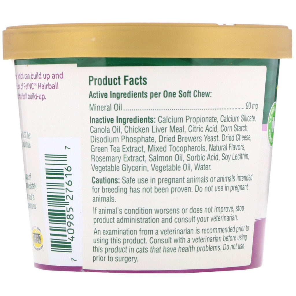 Veterinarian Formulated Hairball Reduction Support for Cats Helps Reduce Hairball Formations Guaranteed Quality – Laboratory Tested NASC- Quality Seal As cats groom themselves they ingest hair which can build up and cause hairballs. Regular brushing and the use of PetNC Hairball Soft Chews helps support the reduction of hairball build-up.Sugg. UseFor use with all cats 6 weeks and older. Cat Weight | # of Soft Chews Up to 10 lbs | 1 soft chew daily 11-30 lbs | 2 soft chews daily Over 30 lbs | 3 soft chews daily Individual results may vary. Top shelf dishwasher safe.Other IngredientsCalcium propionate, calcium silicate, canola oil, chicken liver meal, citric acid, corn starch, disodium phosphate, dried brewers yeast, dried cheese, green tea extract, mixed tocopherols, natural flavors, rosemary extract, salmon oil, sorbic acid, soy lecithin, vegetable glycerin, , vegetable oil, water.Supplement FactsDisclaimerWhile VitaminsUK strives to ensure the accuracy of its product images...